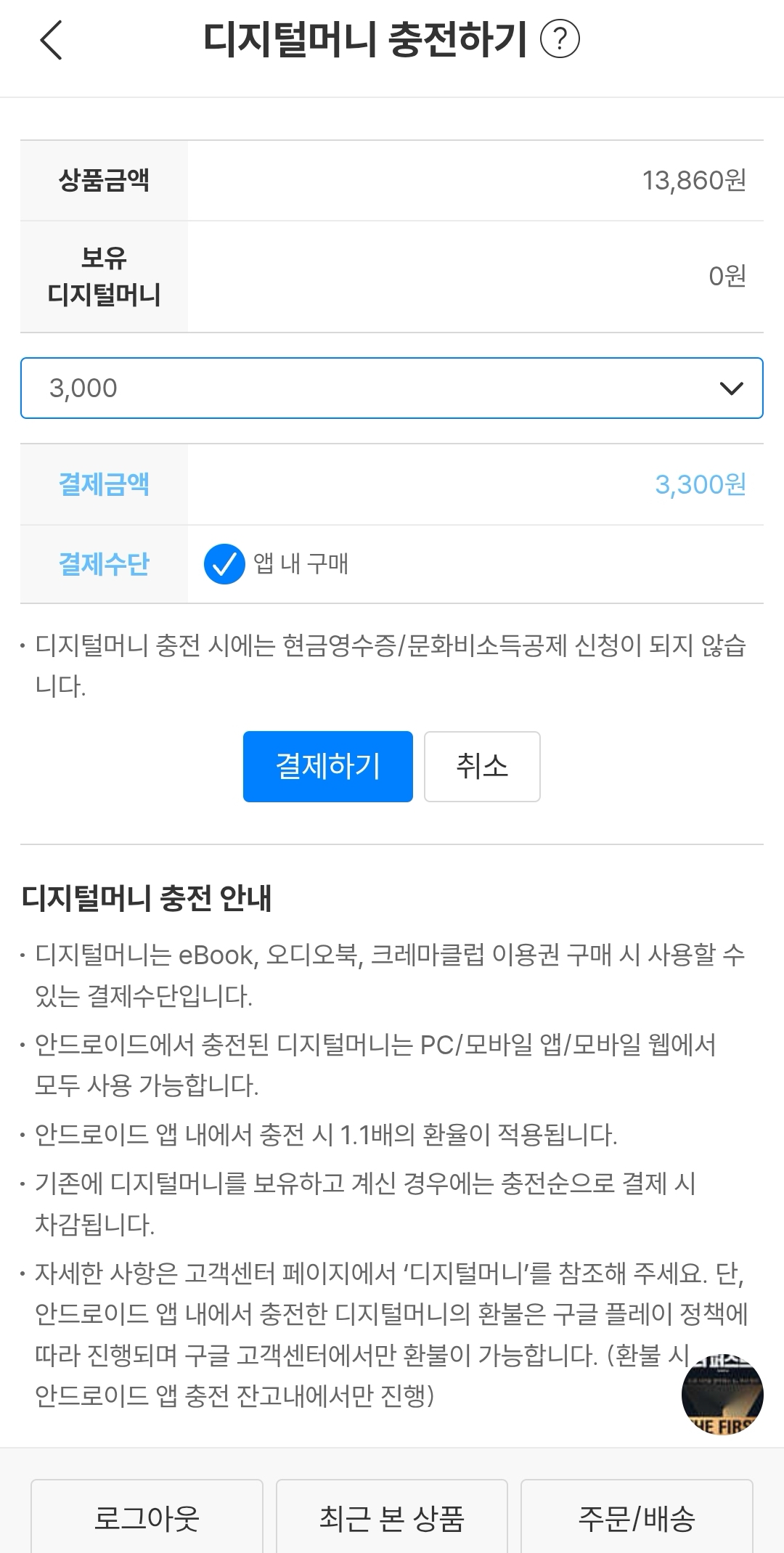이미 IOS에서 당한 경험이 있으니 일단 최소 금액인 3,000원을 눌러봅니다. 으잉? 이것도 10%가 붙어서 결제할 금액은 3,300원이 되네요. "안드로이드 앱 내에서 충전 시 1.1배의 환율이 적용됩니다"란 문장이 보입니다. 애플에 비해서 0.1배 낮기도 하고 부가가치세에 익숙한 대한민국 국민이기에 결제를 하려다가 문득 궁금하였습니다. 현금처럼 사용하는데 10%의 추가 비용을 내야 하는 걸까? 이런 궁금증이 저를 호구의 길에서 벗어나게 해주었습니다.