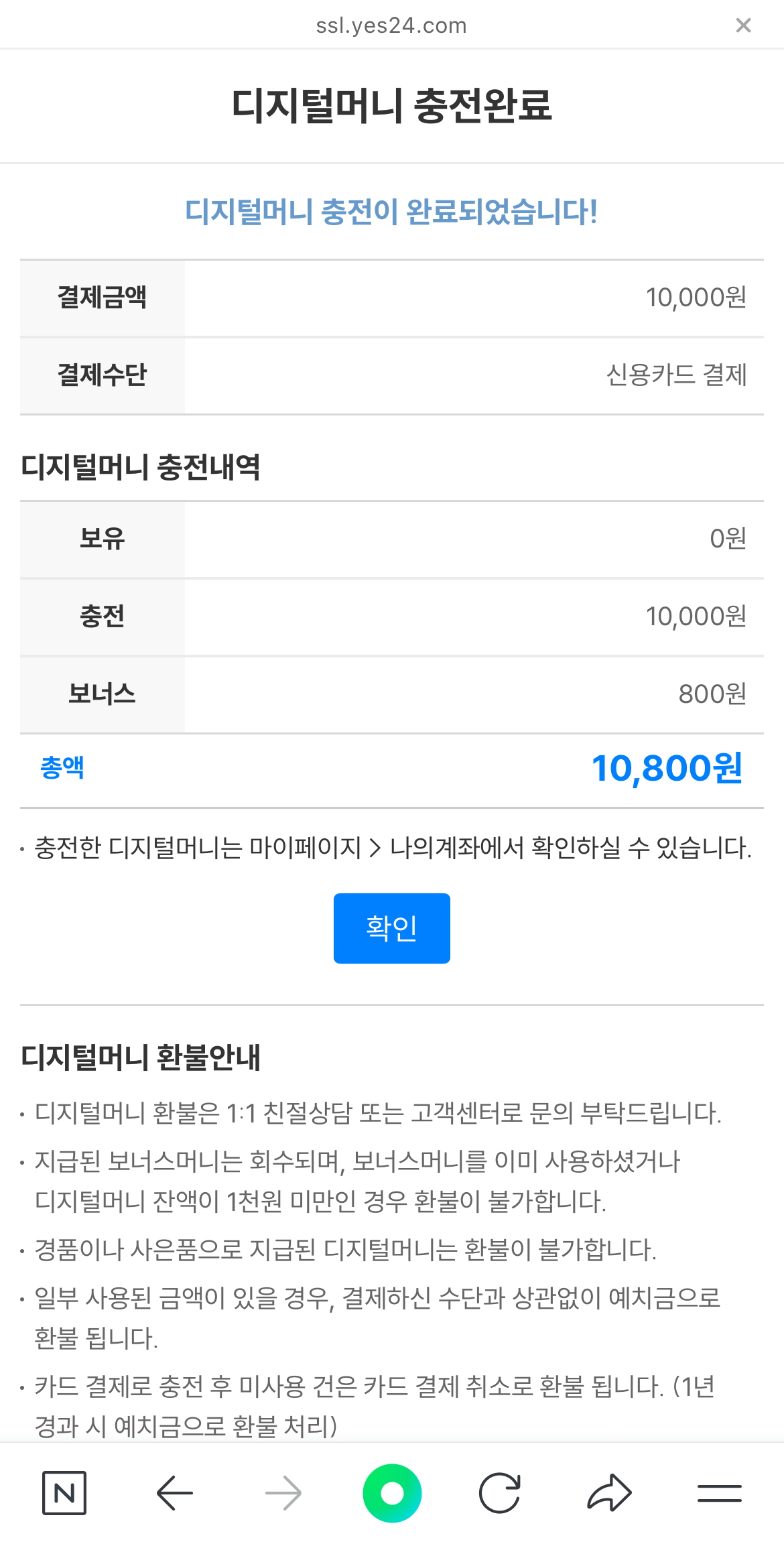 아이폰이던 갤럭시던 예스24 전용어플을 이용해서 충전했다면 큰 금액은 아니지만 손실을 볼 수 있었는데 단지 전용 어플이 아니라 브라우저를 통해서 충전을 했더니 수수료도 없고 보너스까지 준다? 이건 이용을 안 할 수가 없습니다. 쉽고 편하고 익숙하단 생각에 예스24 어플에서 디지털 머니를 충전하여 호구가 되지 마시고 꼭!! 핸드폰이나 노트북 인터넷 브라우저를 이용하여 예스24 로그인 후 디지털 머니 충전하여 수수료도 내지 말고 보너스도 챙기시기 바랍니다.