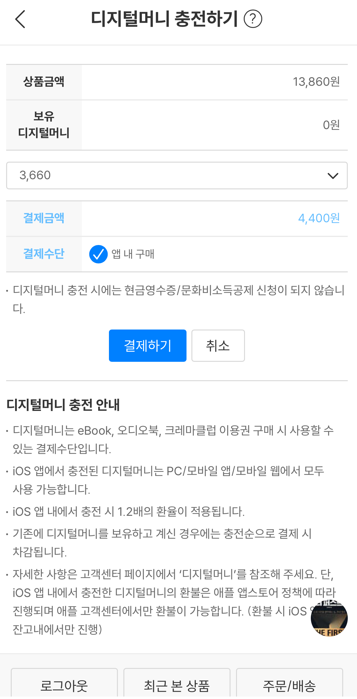 가장 최소 단위인 3,660원을 눌렀더니 실제 결제할 금액은 4,400원? 정말 어이가 없어서 디지털머니 충전 안내를 읽어보는데 "IOS 앱 내에서 충전 시 1.2배의 환율이 적용됩니다"란 문구가 보입니다.