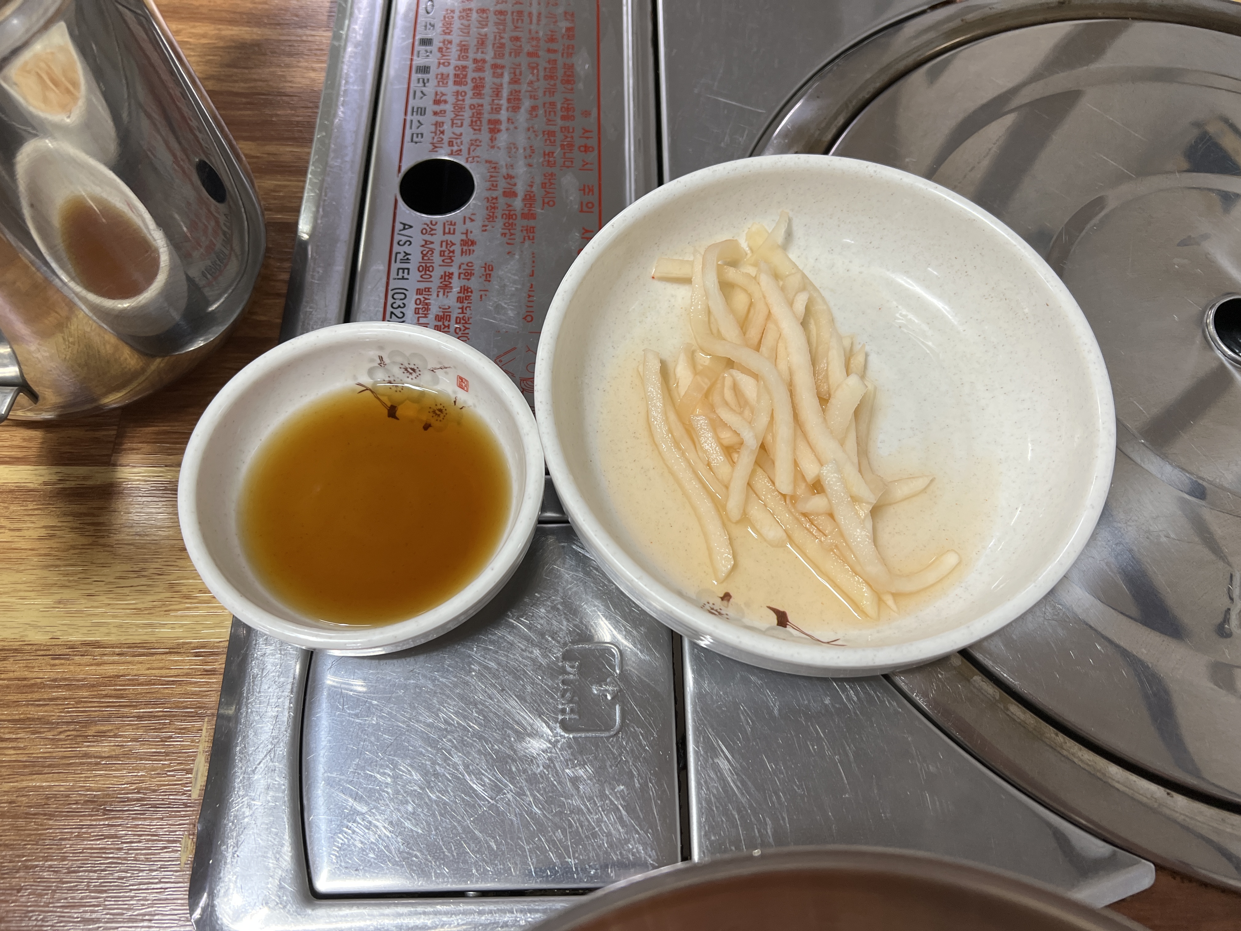 기본 반찬은 무생채와 만두를 찍어먹기 위한 간장이 제공됩니다.