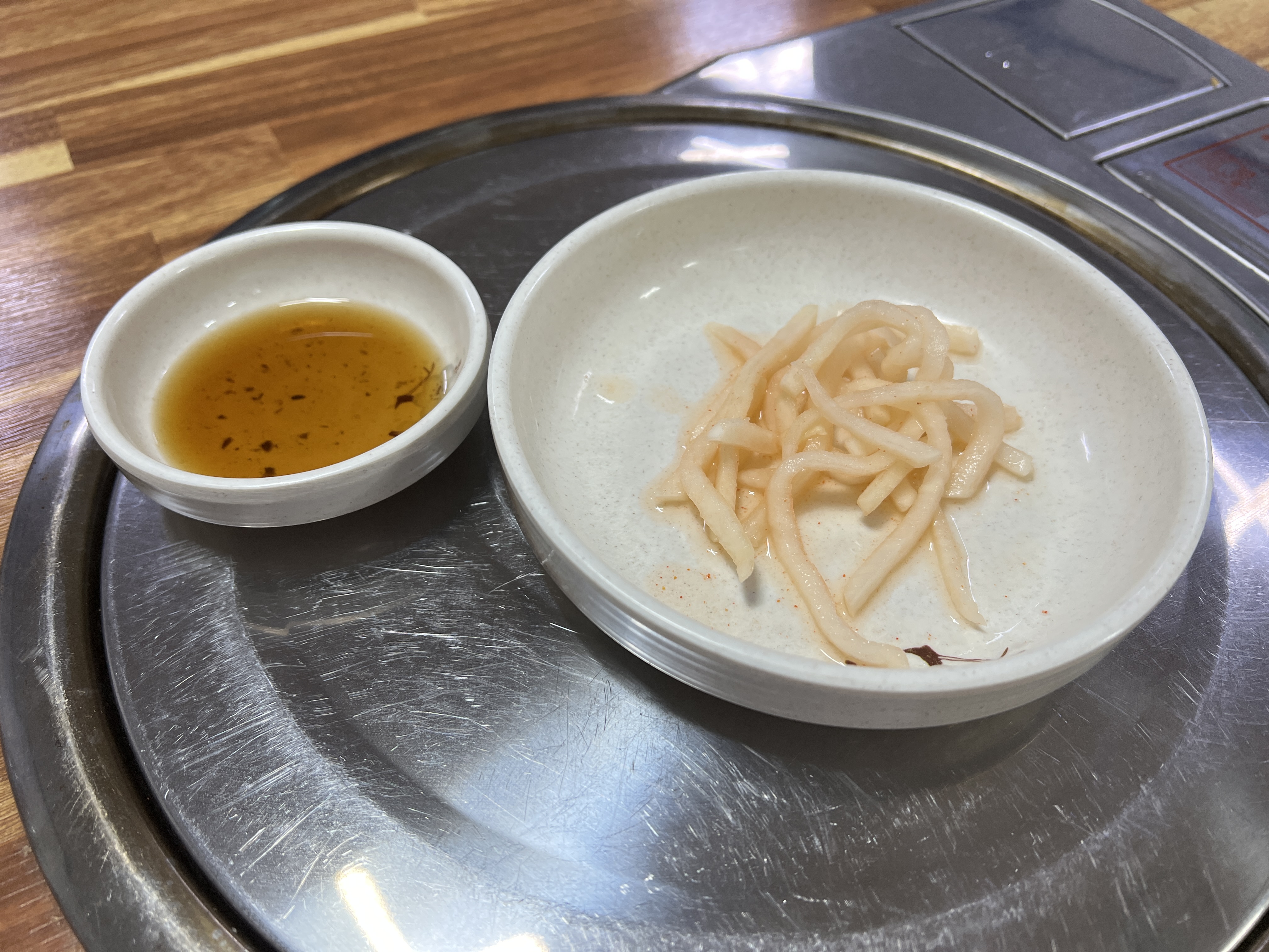 메뉴가 냉면뿐이라 기본반찬이라 할것도 없는 무와 만두를 찍어먹을 간장이 나왔습니다. 고려랭면의 하이라이트는 뜨거운 육수인데 짭짤~~하니 너무 맛있습니다. 인당 2~3잔은 기본으로 마시게 됩니다.