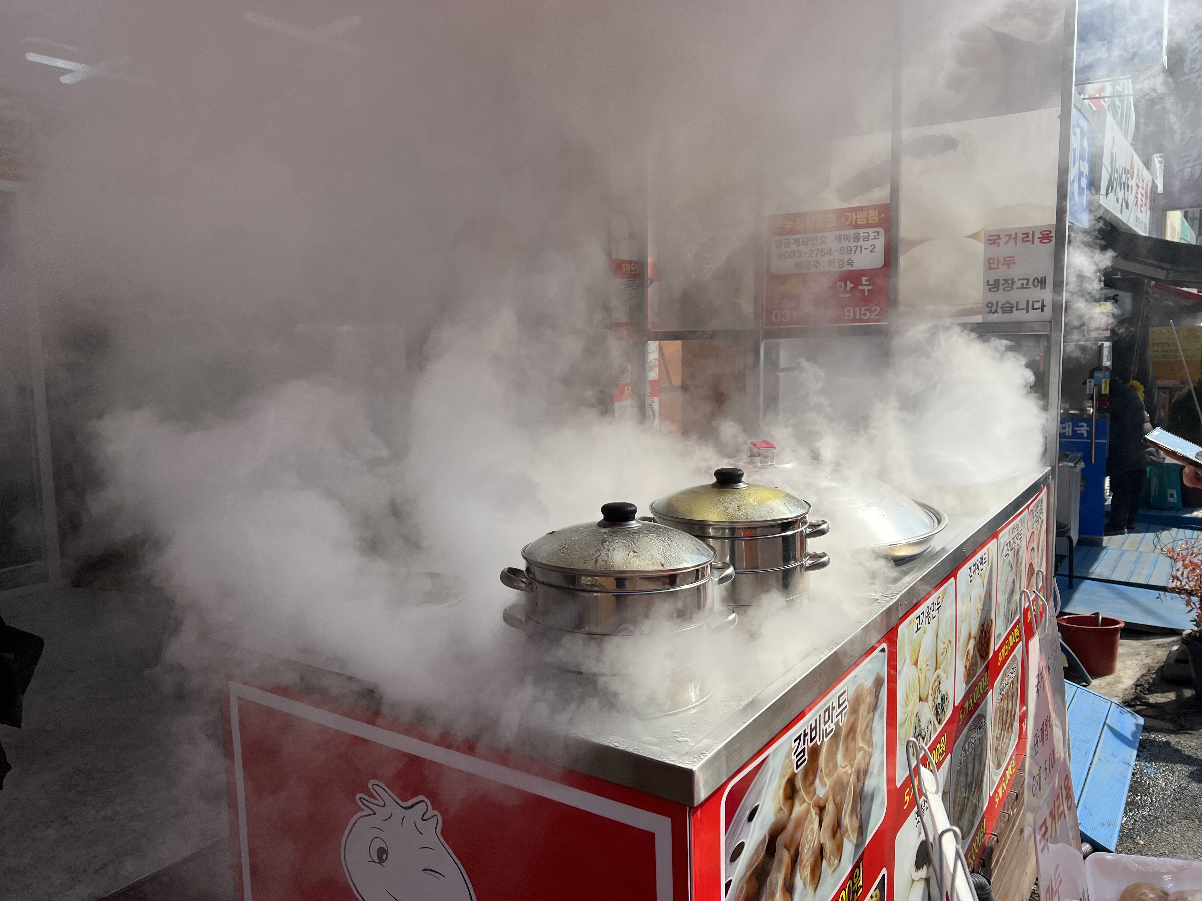 곽선생 왕만두는 관양시장 분식 맛집으로 유명한 삼선당에서 가까운 관양시장 출입구 쪽에 위치해 있습니다. 오픈한 지 얼마 안 된 건지 간판 등 외관이 새것 같습니다. 만두가게에서 마치 화재가 난 것처럼 번지는 찜기의 증기를 보고 홀린 듯이 가게 앞으로 갔습니다.