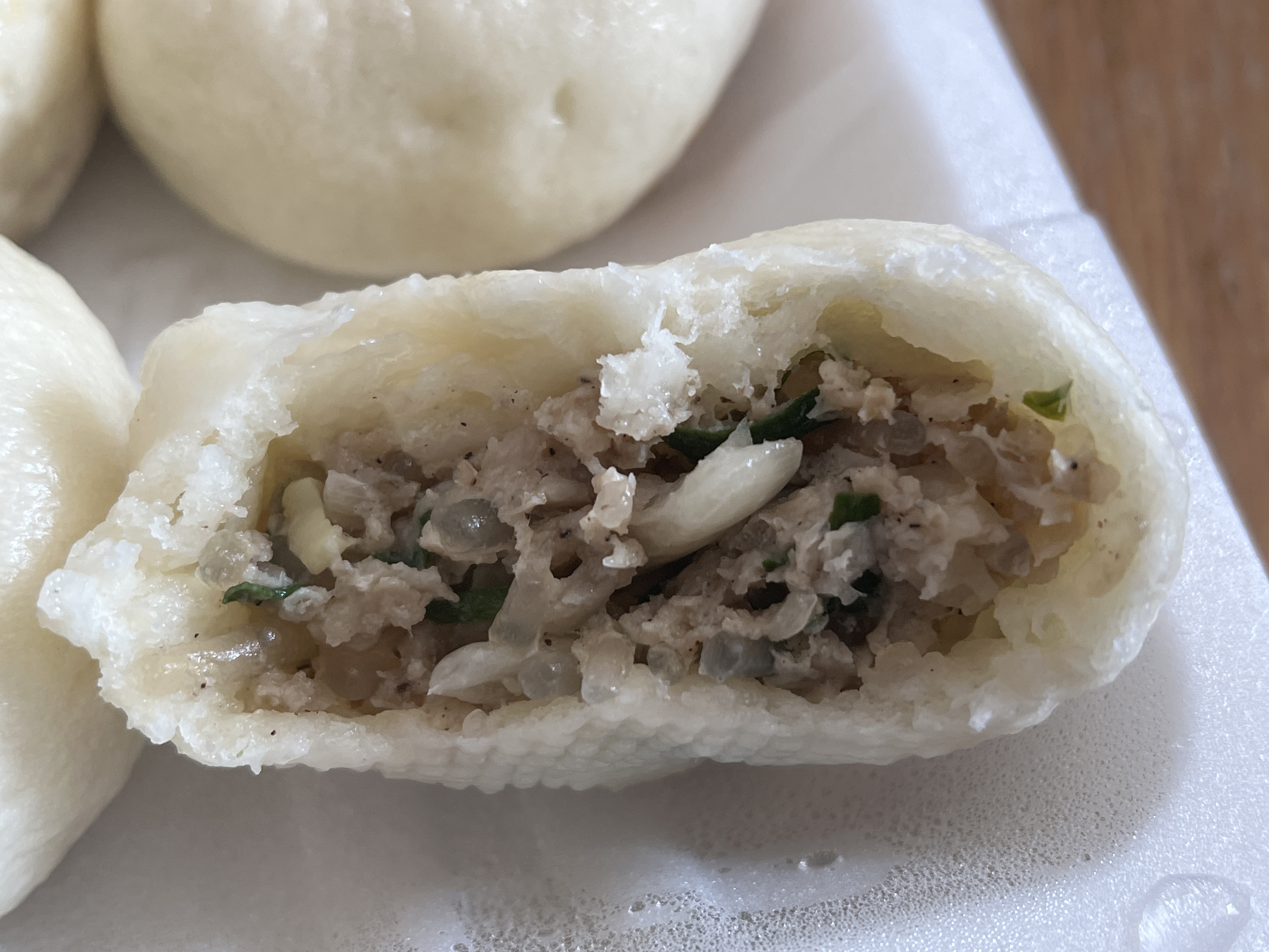 다행히 매대 아래쪽에 메뉴판은 증기에 가려지지 않아서 메뉴를 보고 평소 좋아하는 포자만두(왕만두)를 고기반 김치반 1인분(5개/5,000원), 왠지 시그니처 같은 느낌의 얇은피 고기새우교자만두(5개/5,000원)을 주문하였습니다. 왕만두는 1인분 주문 시 고기반 김치반으로 주문가능하여 어떤 맛을 3개 넣어드릴까요 물어봐주시는데 고기새우교자만두는 반반이 불가하여 고기로 1인분 주문하였습니다. 주문한 메뉴 외에도 갈비만두, 고기/김치 교자만두, 옛날영양술빵, 옛날찐빵 등 다양한 메뉴를 판매 중이셨습니다.