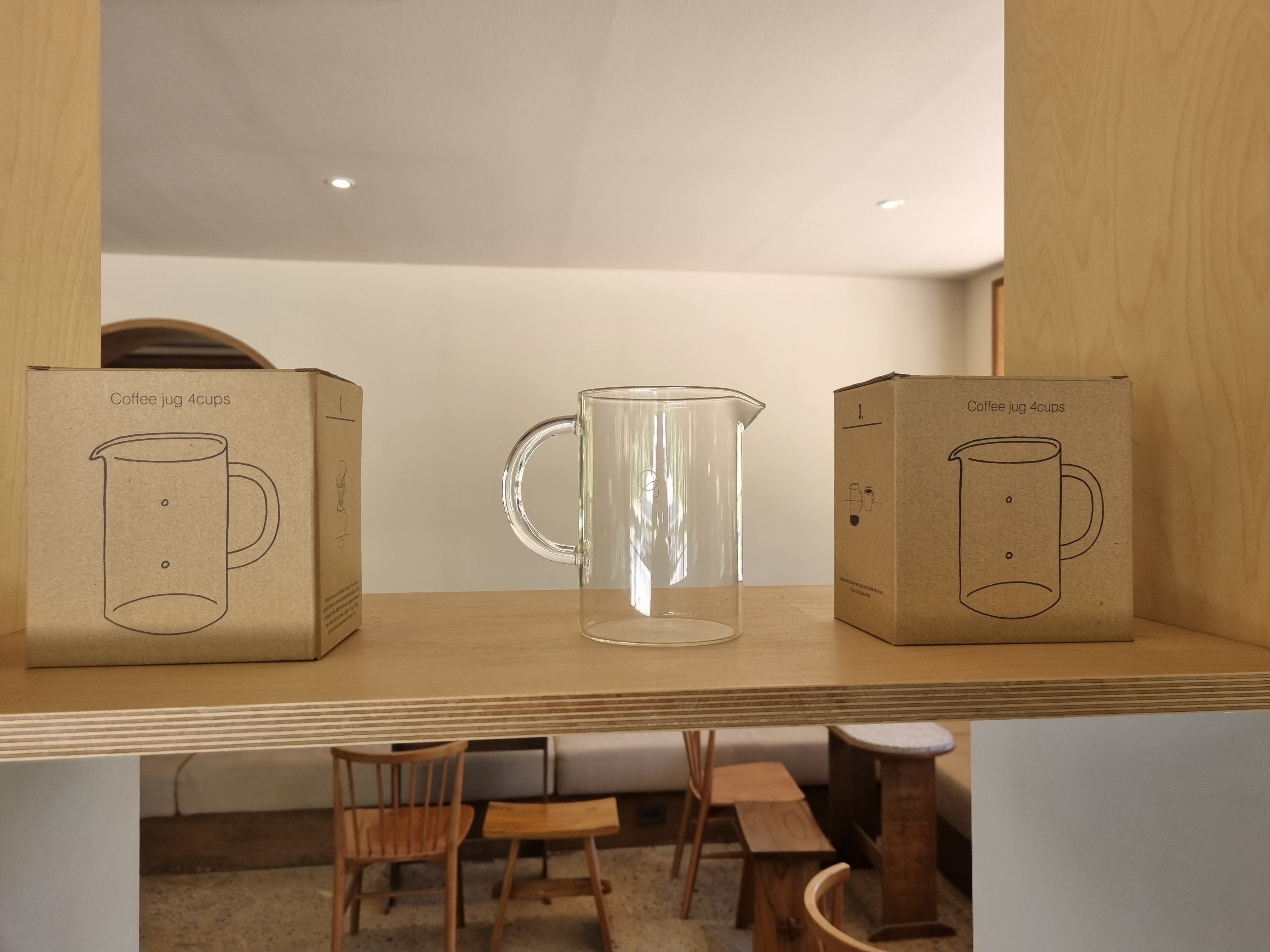 커피 저그와 글라스, 텀블러, 원두가 디스플레이되어 있었습니다.