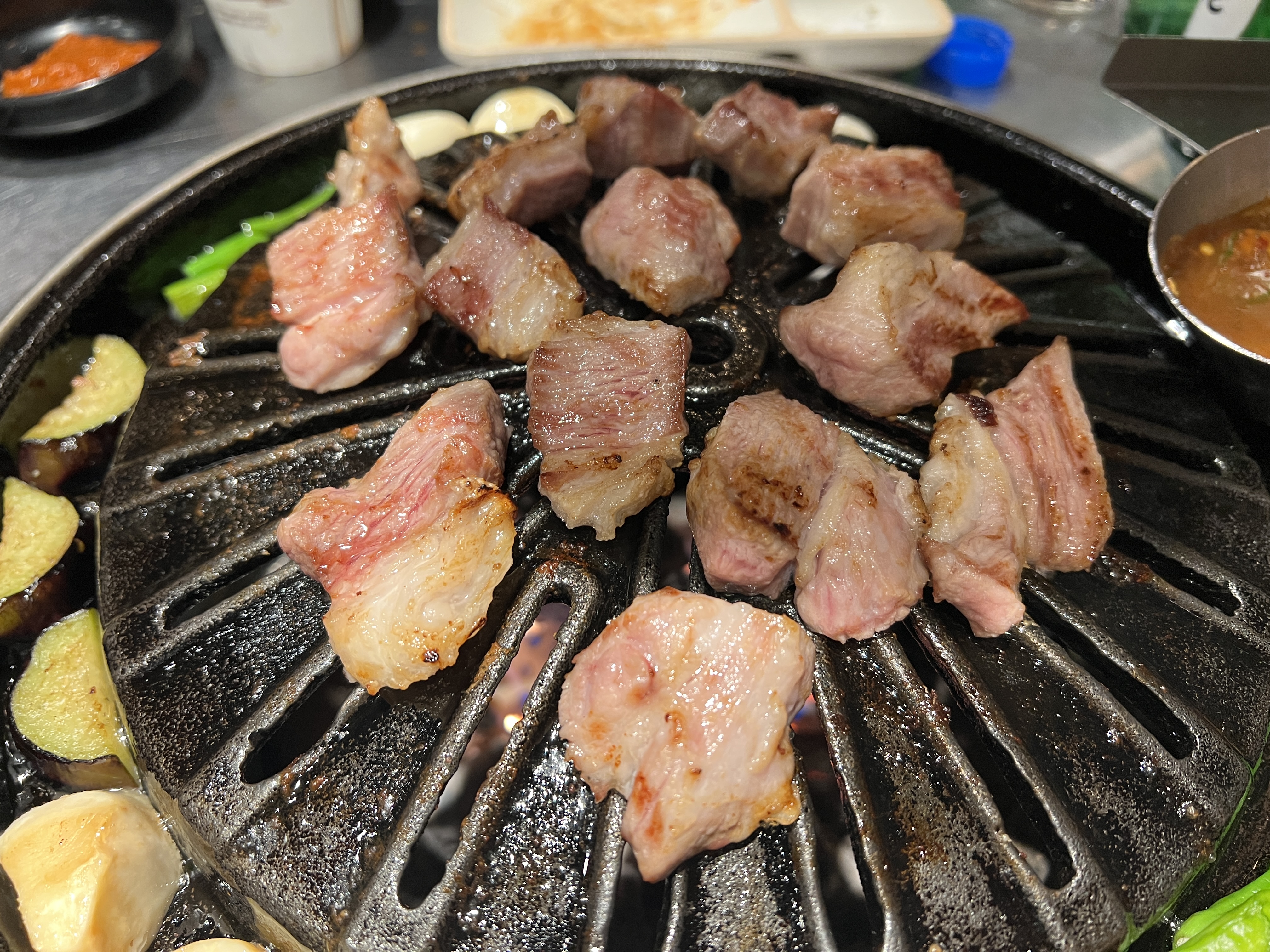 고기를 가져와서 불판위에 얹어서 맛있게 구워주십니다. 역시 고기는 전문가의 손길로 구워야 맛이 있는 것 같습니다. 마늘종, 버섯, 가지, 고추, 마늘등을 사이드로 구워주고 맛있는 고기는 가운데에서 잘 익어갑니다. 한 면만 익었는데도 고기가 너무 좋아 보입니다.