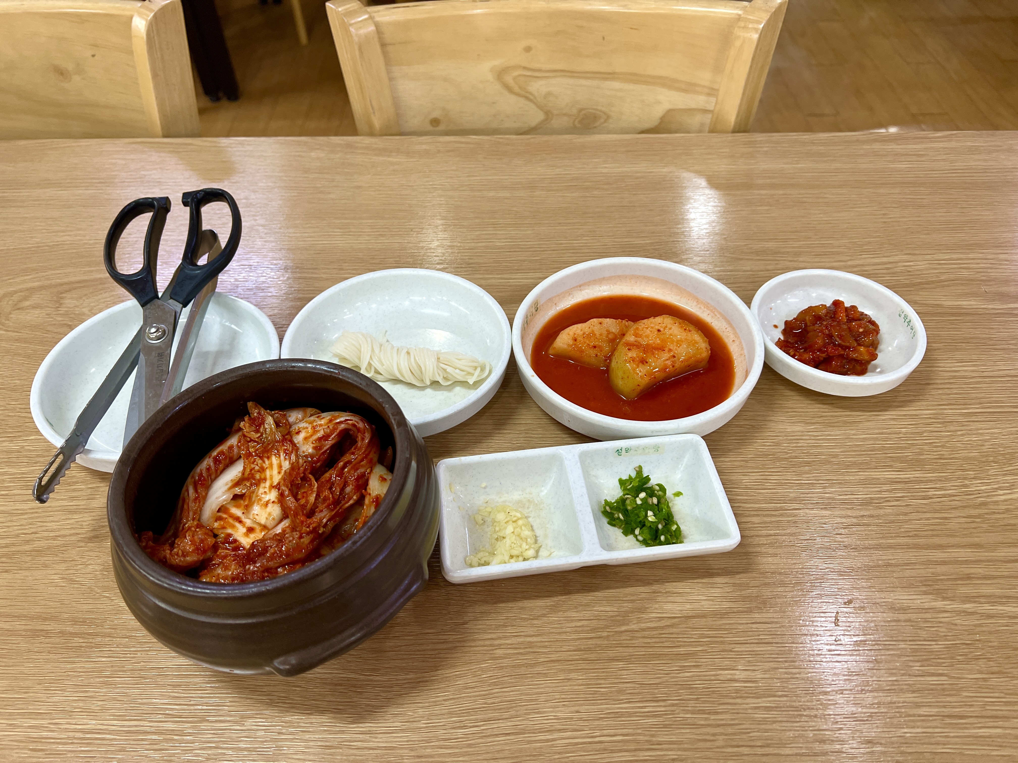 주문하고 얼마 지나지 않아 기본 반찬을 세팅해줍니다. 김치는 잘라먹을 수 있게 제공되고 오징어 젓갈이 나오는 게 너무 좋았습니다. 뭔가 기본 반찬에 스페셜 반찬이 추가된 느낌이 들었습니다.