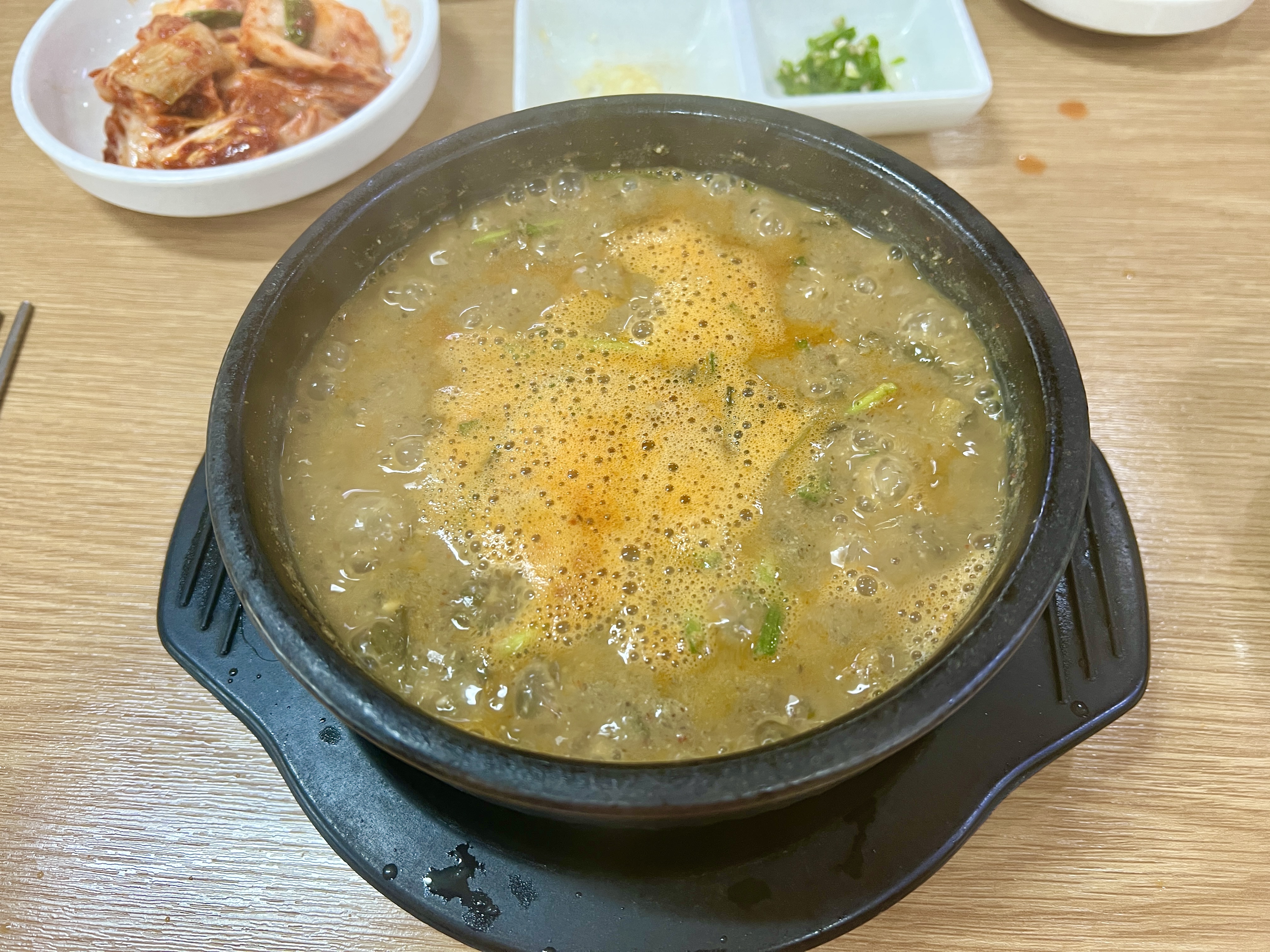 주문하고 얼마 지나지 않아 기본 반찬을 세팅해줍니다. 김치는 잘라먹을 수 있게 제공되고 오징어 젓갈이 나오는 게 너무 좋았습니다. 뭔가 기본 반찬에 스페셜 반찬이 추가된 느낌이 들었습니다.