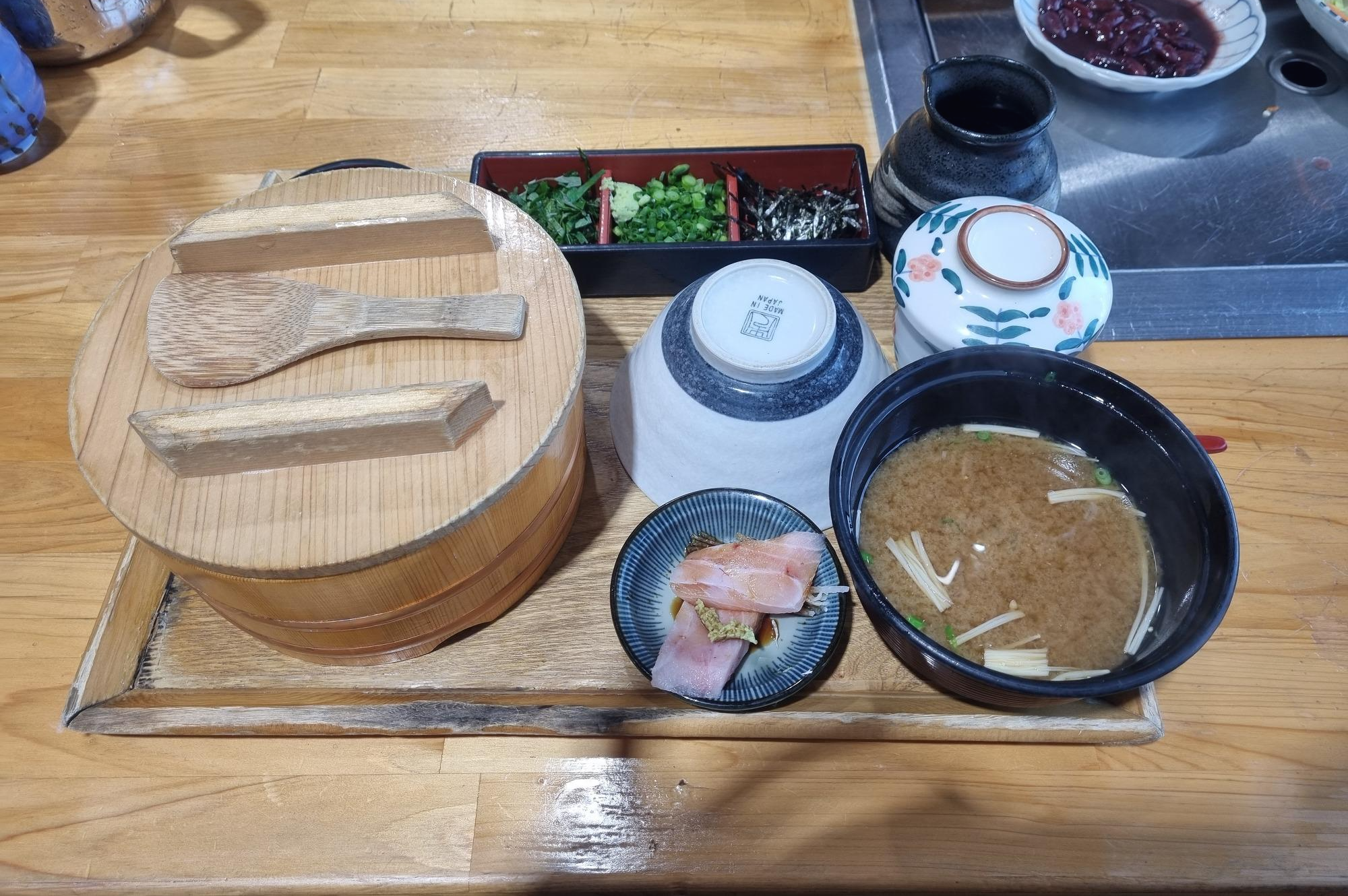 정말 정갈하게 참치회 조금, 장국, 계란찜, 다시물, 김, 파, 깻잎, 다시마가 나무 쟁반에 올려져 있습니다.