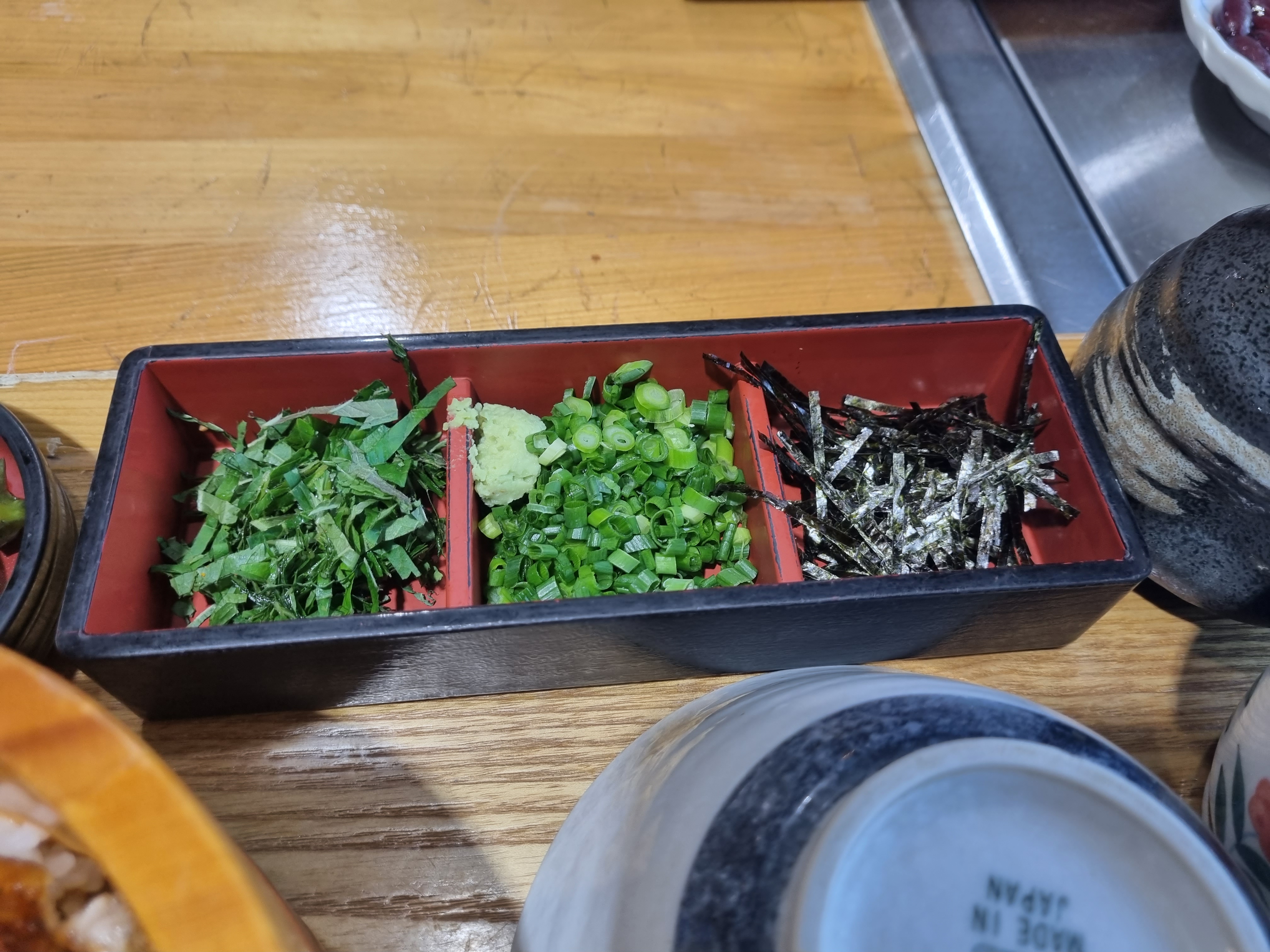 다음으로 양평 장어덮밥 맛집 노다지 장어에서 알려준 세 번째 방법인 김, 와사비, 파, 깻잎 등을 넣고 다시물을 부어 말아먹어보았습니다.