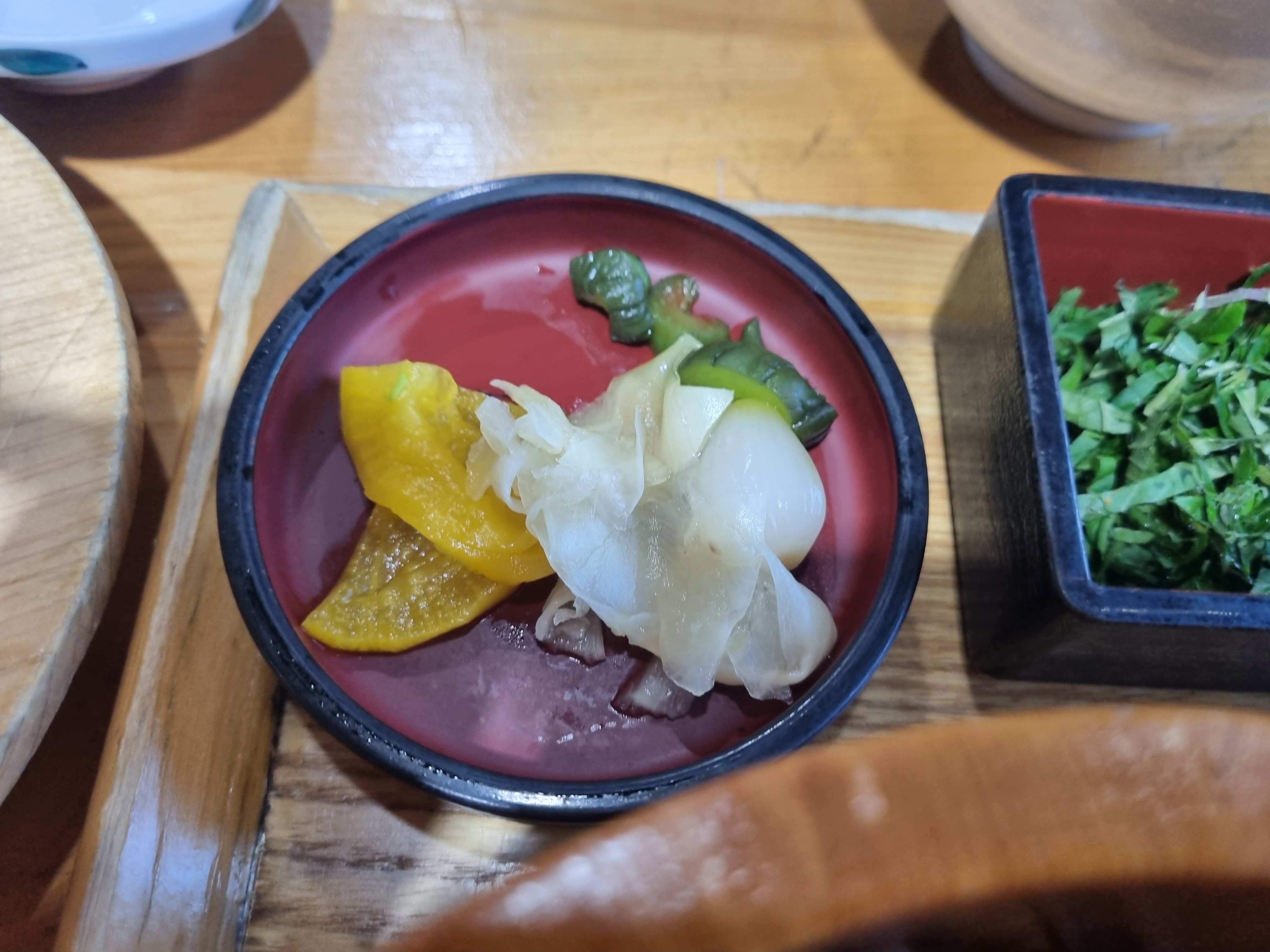 마지막으로 반찬 격인 단무지, 초생강, 락교, 피클이 있습니다.