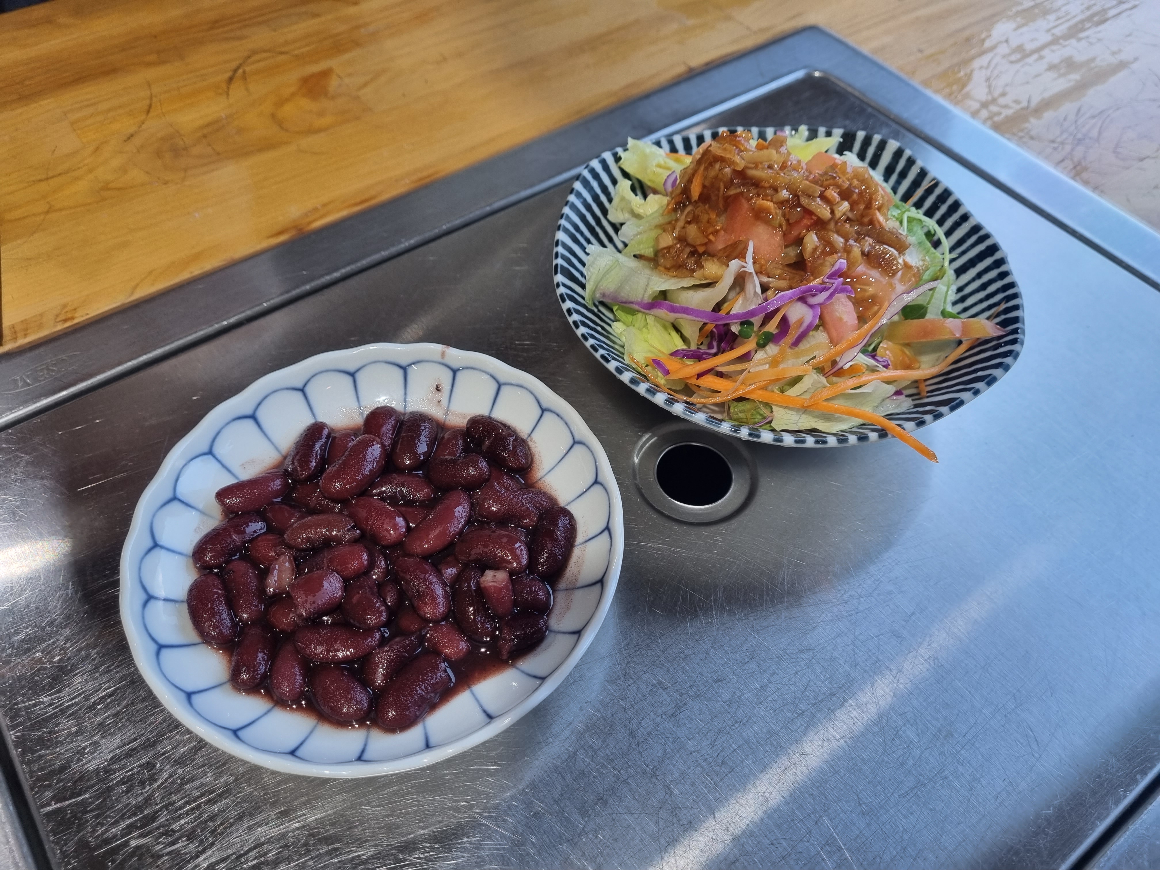 콩을 달콤하게 조린 것과, 토마토가 첨가된 샐러드를 먼저 제공하여 주십니다.
