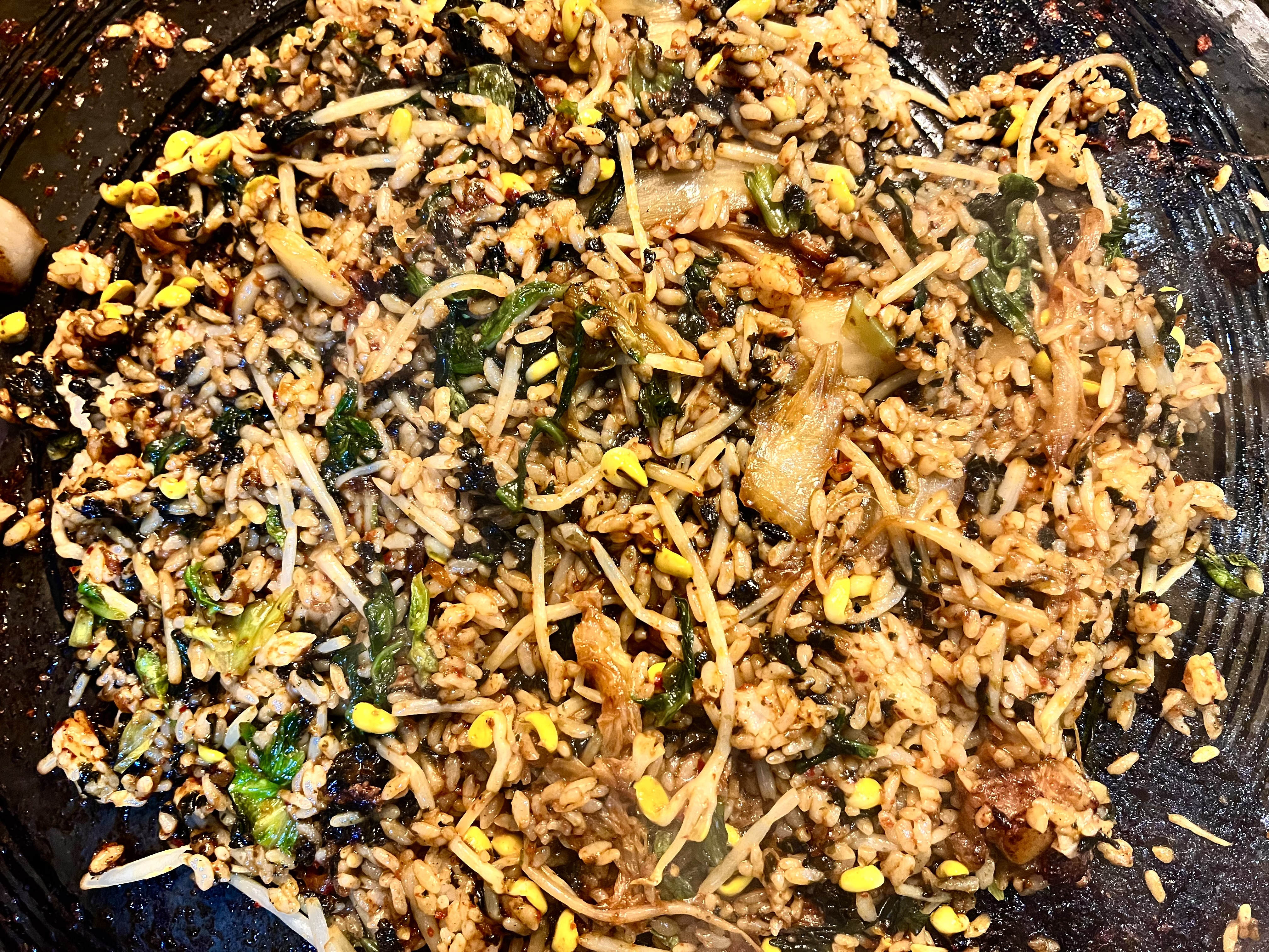 돼지기름으로 코팅된 솥뚜껑에서 맛있게 볶아주십니다.