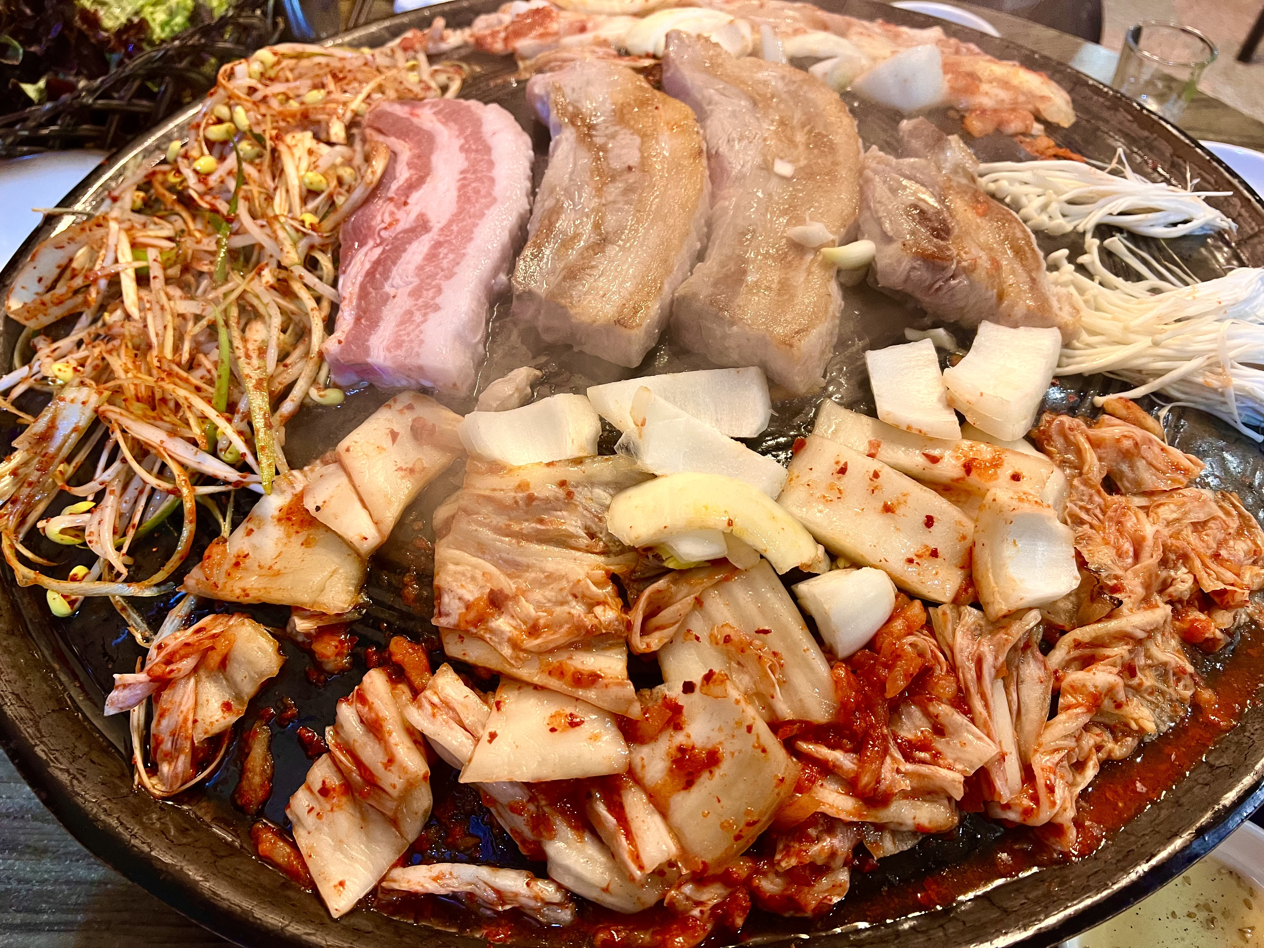 - 솥뚜껑에 구운 삼겹살과 김치, 파&콩나물 무침 조합... 더 이상 무슨 말이 필요할까...