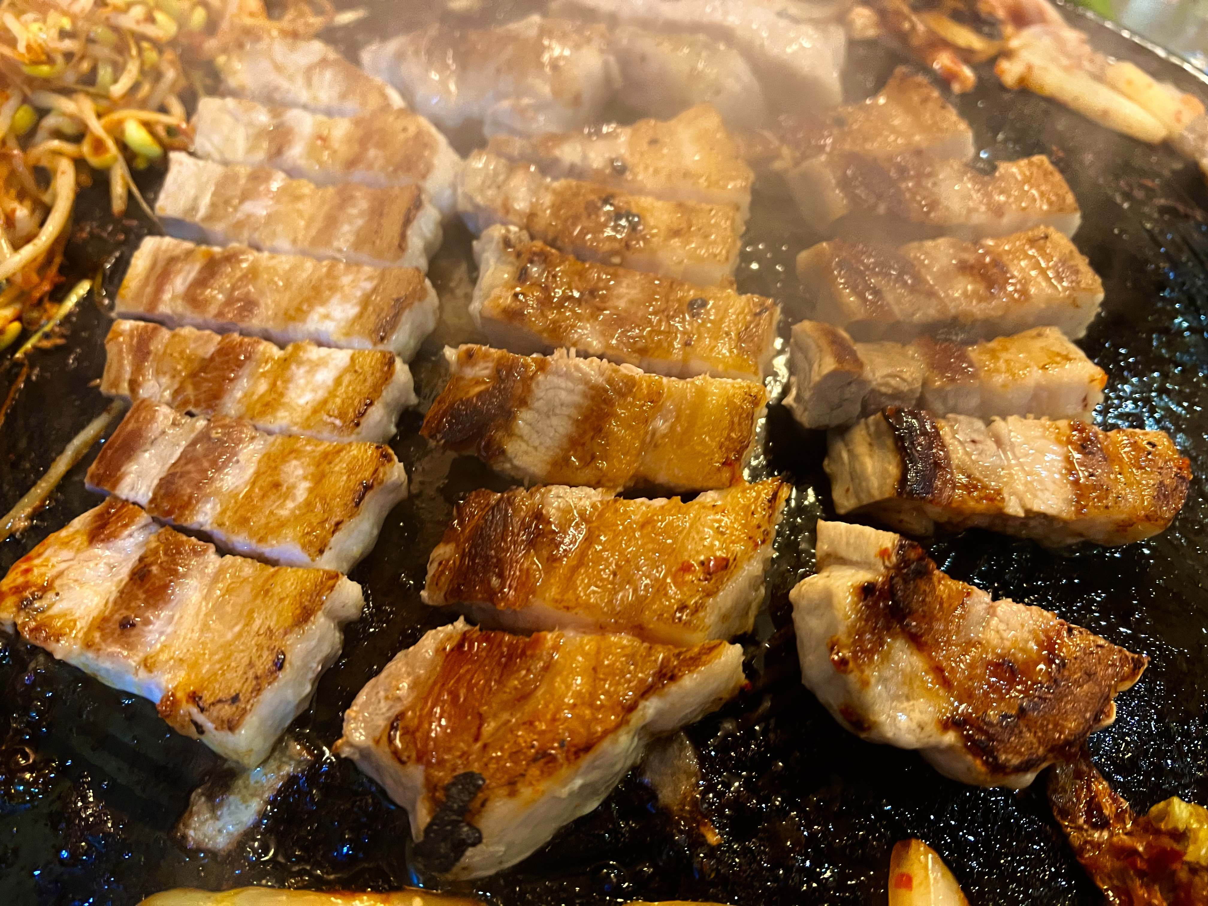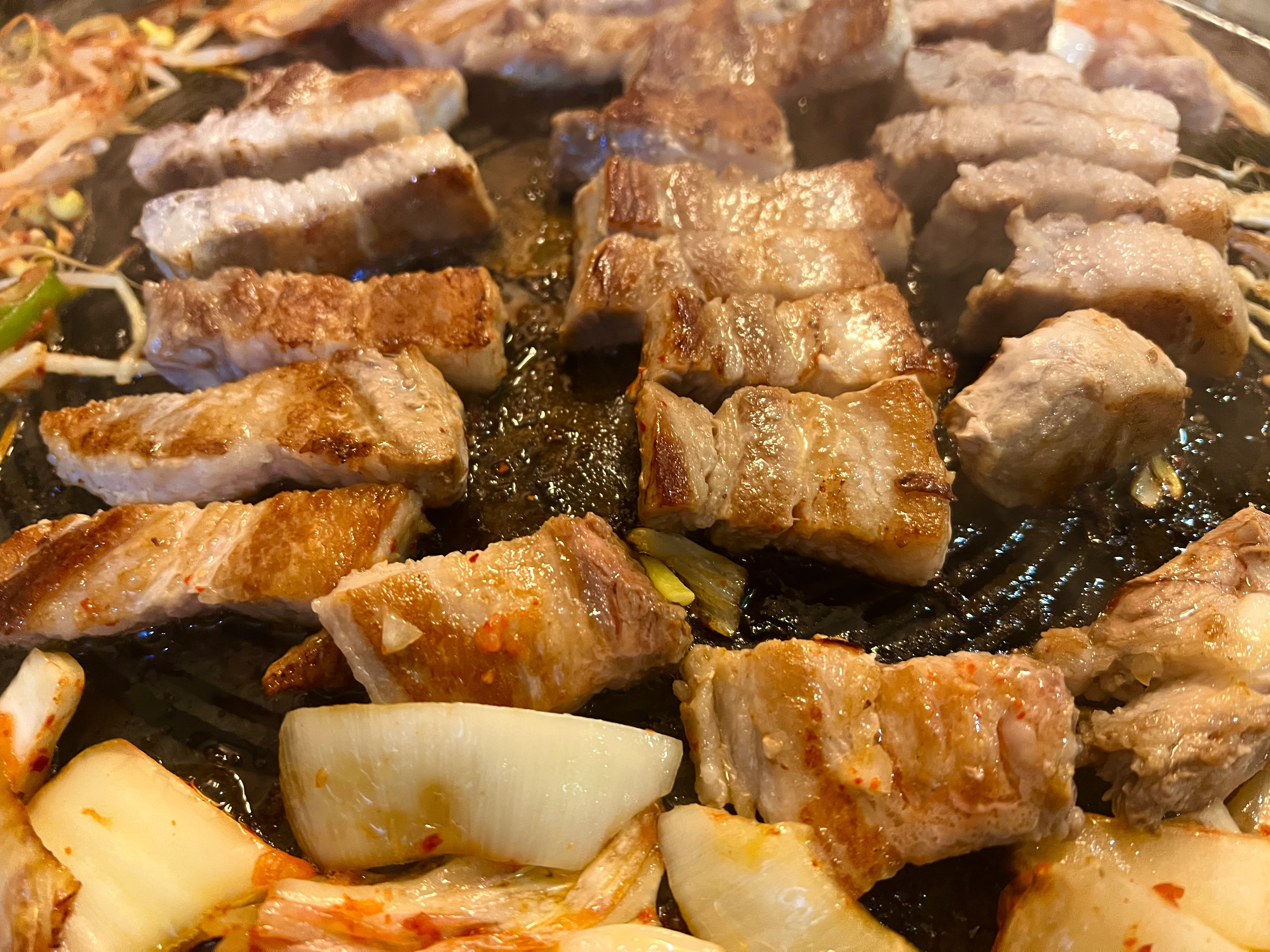 잘 익은 삼겹살을 구운 김치, 구운 파&콩나물 무침, 구운 양파와 함께 먹는 맛은 말해 뭐하겠습니까