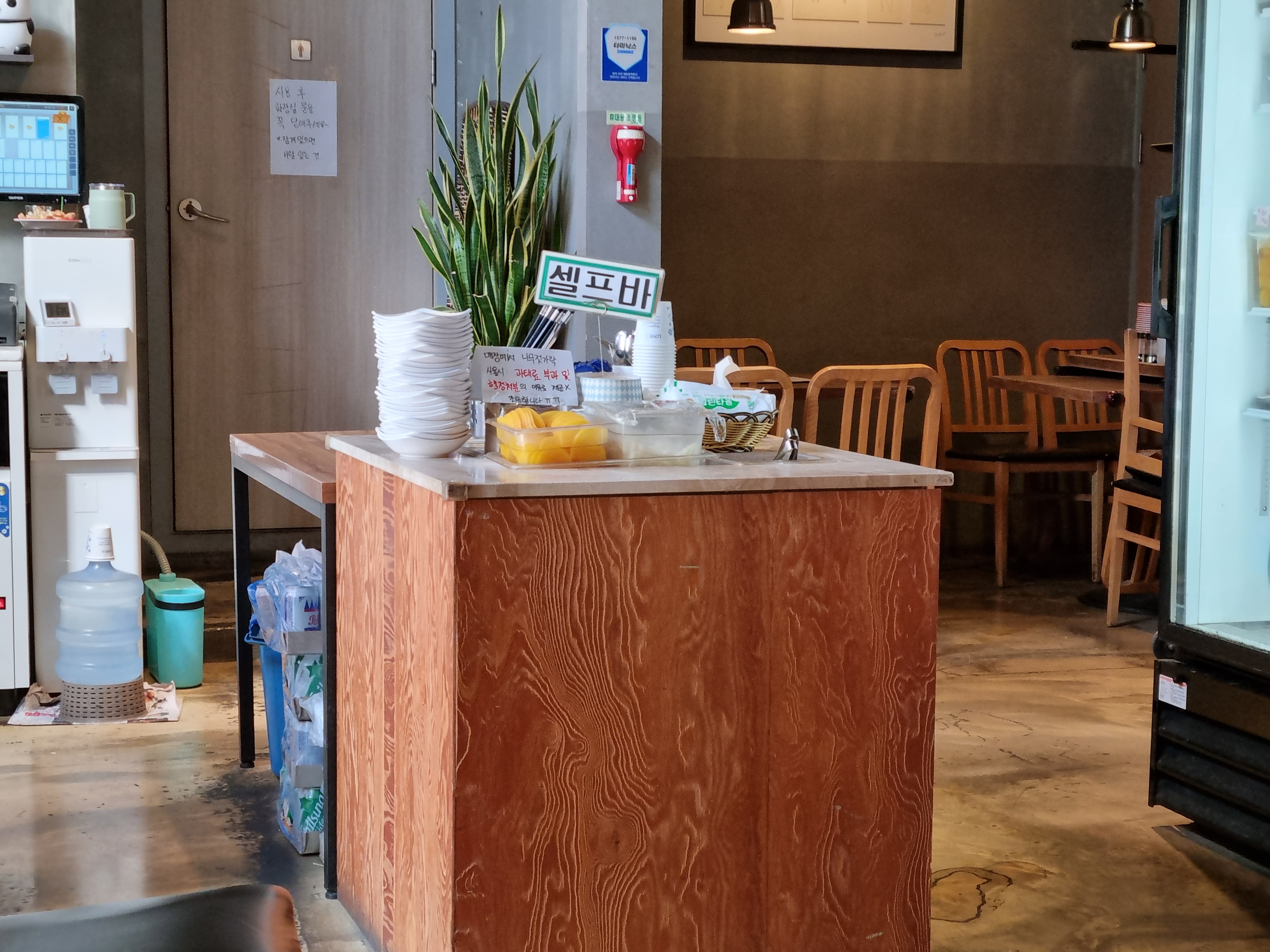 셀프바 뒤로 보이는 좌석은 4인 테이블이 3개 있으나 1개만 사용할 수 있었습니다.