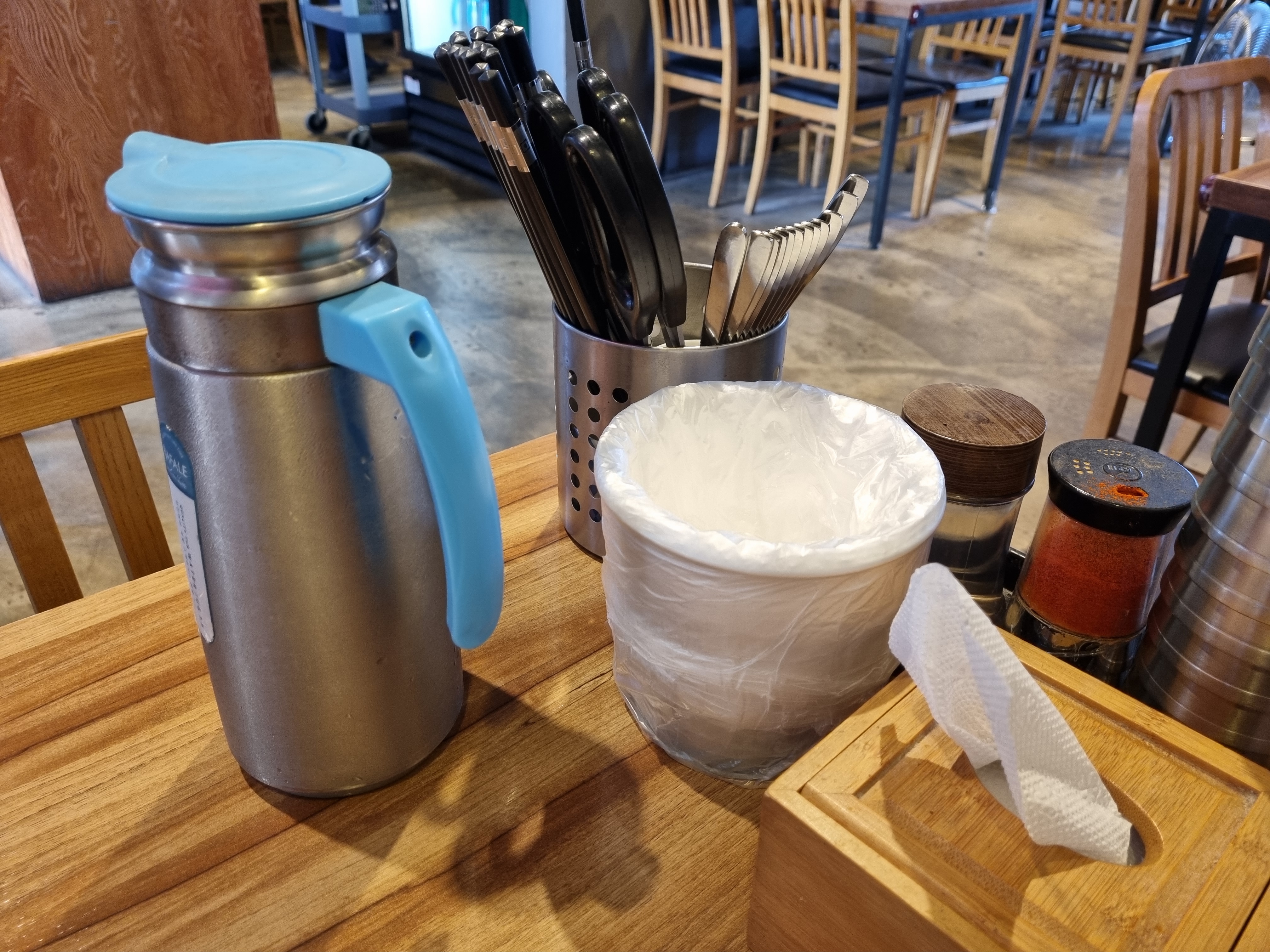 나머지는 물컵, 수저, 식초, 고춧가루, 티슈가 배치되어 있었습니다.