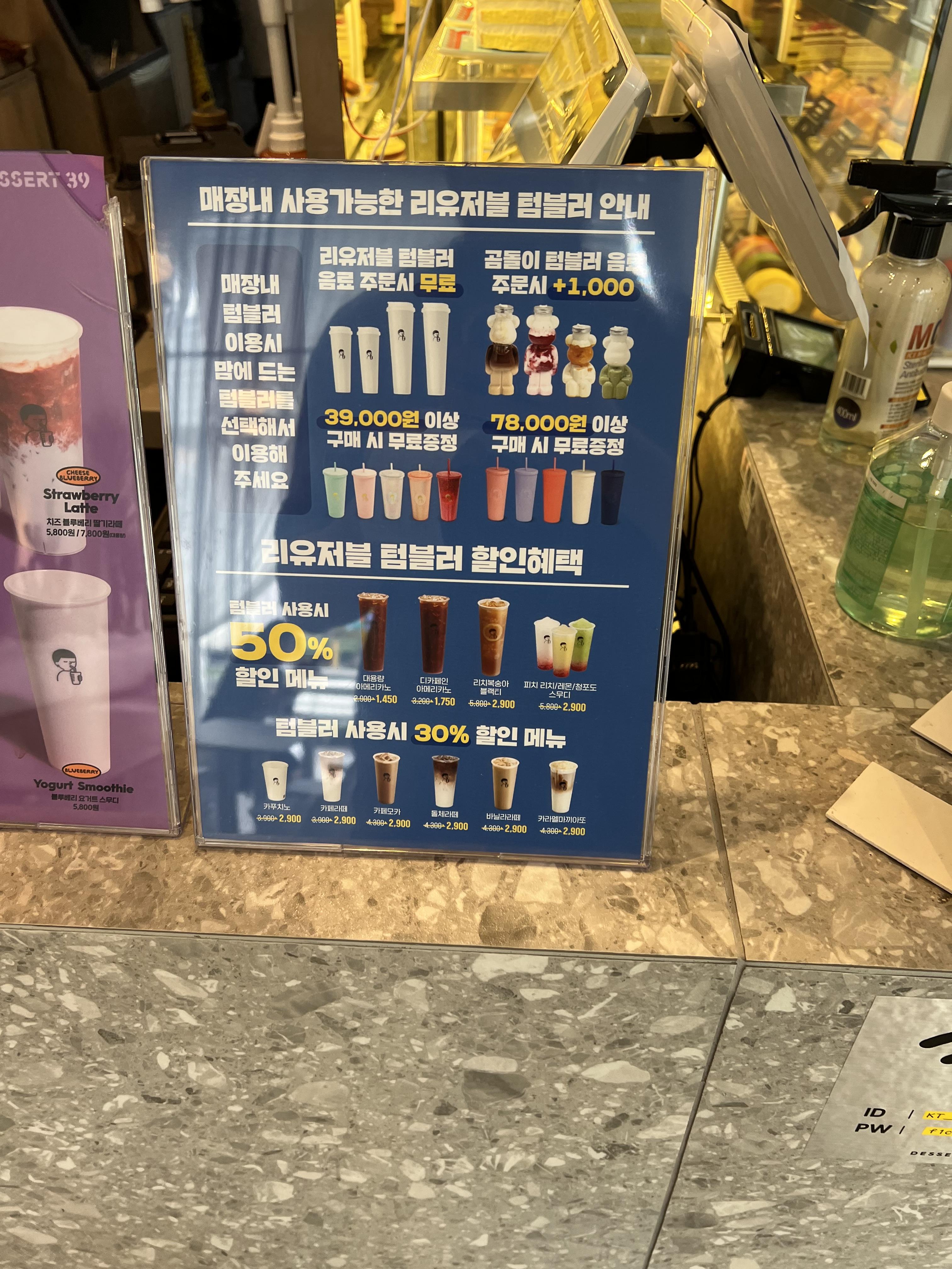 아래를 보시면 리유저블컵 또는 텀블러 사용 시 할인율이 표기되어 있으니 참고하시면 될 것 같습니다.