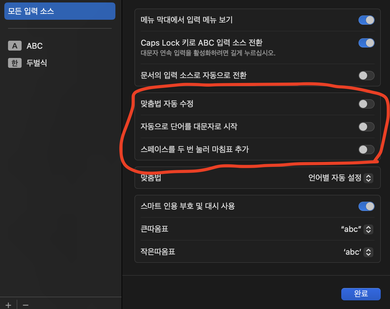 위 설정을 꺼주시면서 맞춤법 자동 수정 및 자동으로 단어를 대문자로 시작 설정도 함께 꺼주시면 더욱 쾌적한 맥북 사용을 하실 수 있습니다. 저 정도 메뉴는 키보드 설정에서 바로 변경할 수 있게 하면 좋을 텐데 "입력소스" -> "편집"을 한 번 더 눌러주고 설정을 변경해야 해서 찾기가 쉽지 않은 것 같습니다. 팀쿡이 이 포스팅을 보고 있다면 향후 맥 OS 출시 때 수정해 줬으면 좋겠습니다.