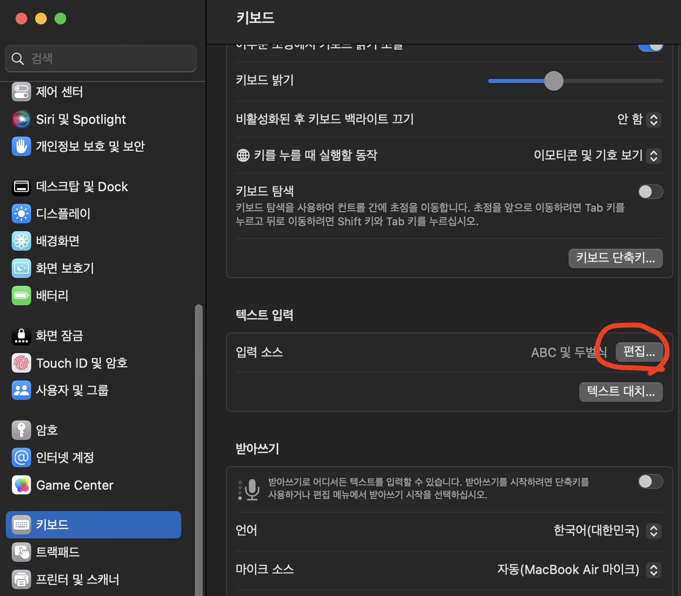 2. 왼쪽 하단의 "키보드" 클릭 후 입력소스 내에 편집 클릭