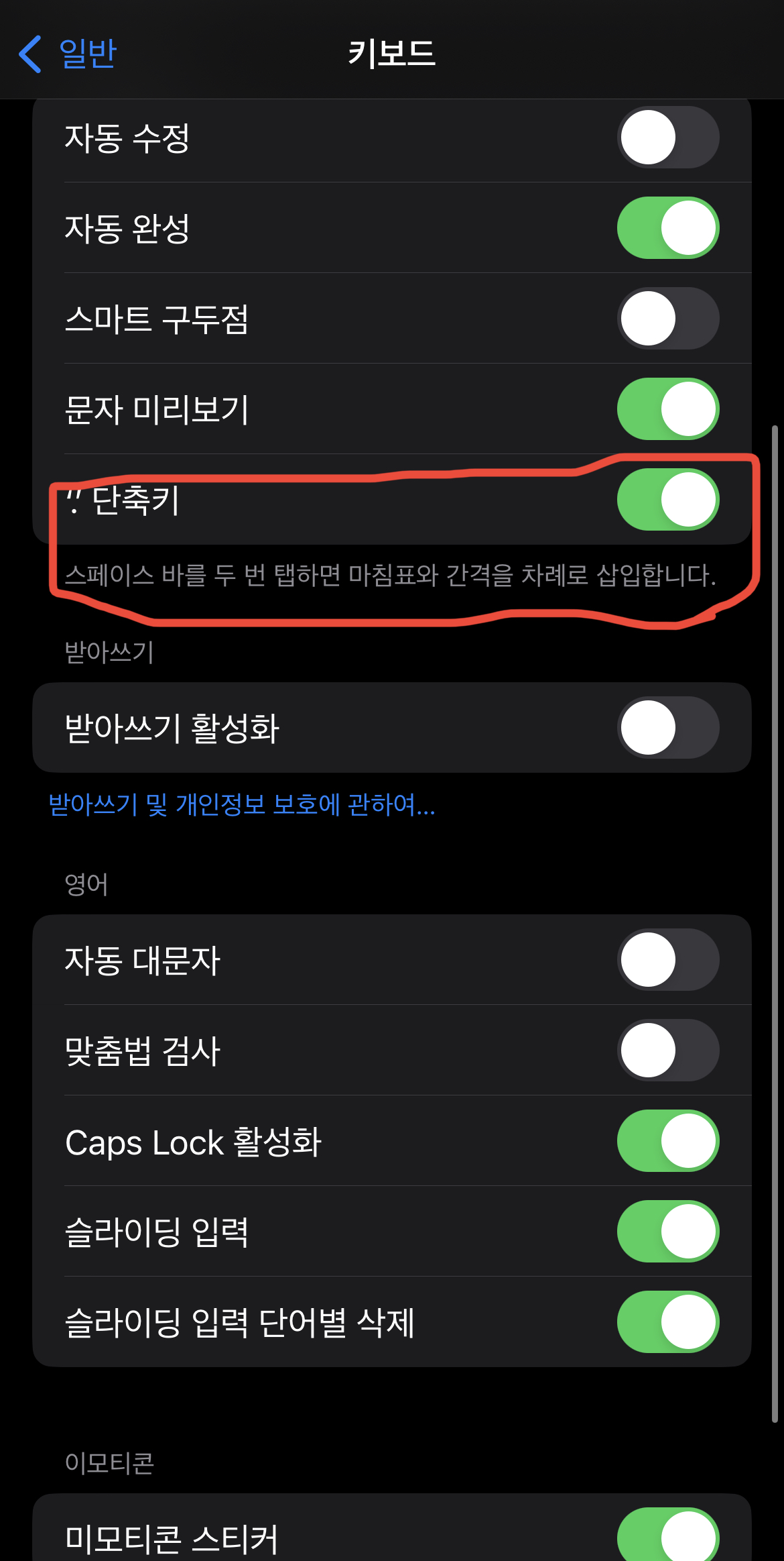 위와 같이 설정을 해놓으면 텍스트를 입력하고 스페이스바를 두 번 눌러도 마침표가 입력되지 않습니다. 그 외에 자동수정과 스마트 구두점 설정 그리고 자동 대문자, 맞춤법 검사 옵션은 꺼두시면 텍스트 입력 시 편합니다.