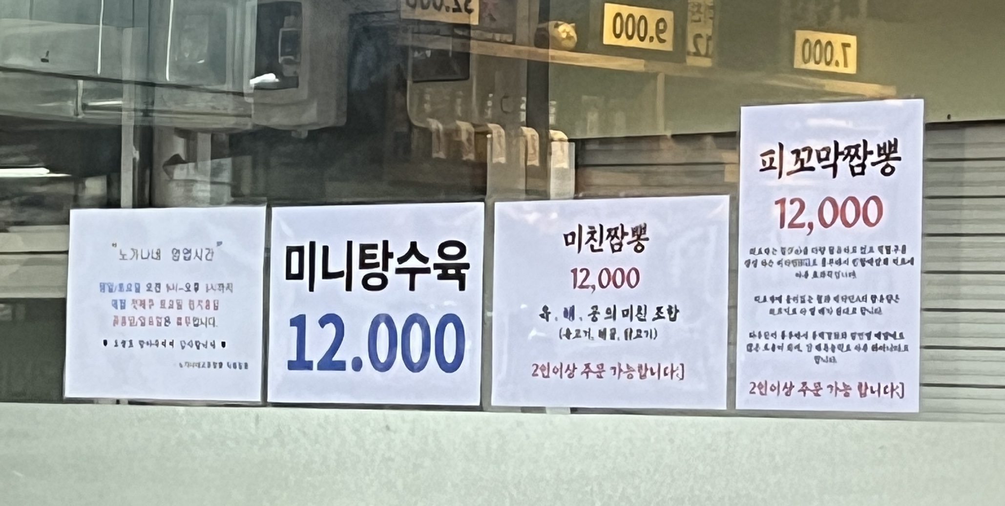 요즘 전기, 가스 요금도 오르고 식자재 가격도 오르는 등 물가가 장난이 아니죠? 명가노가나네 교동짬뽕도 짬뽕이 1,000원 인상되었습니다. 미니탕수육도 12,000원이 되었고 미친 짬뽕과 피꼬막짬뽕이란 신메뉴가 등장했네요. 미친 짬뽕과 피꼬막짬뽕은 2인이상 주문가능하니 참고하시기 바랍니다.