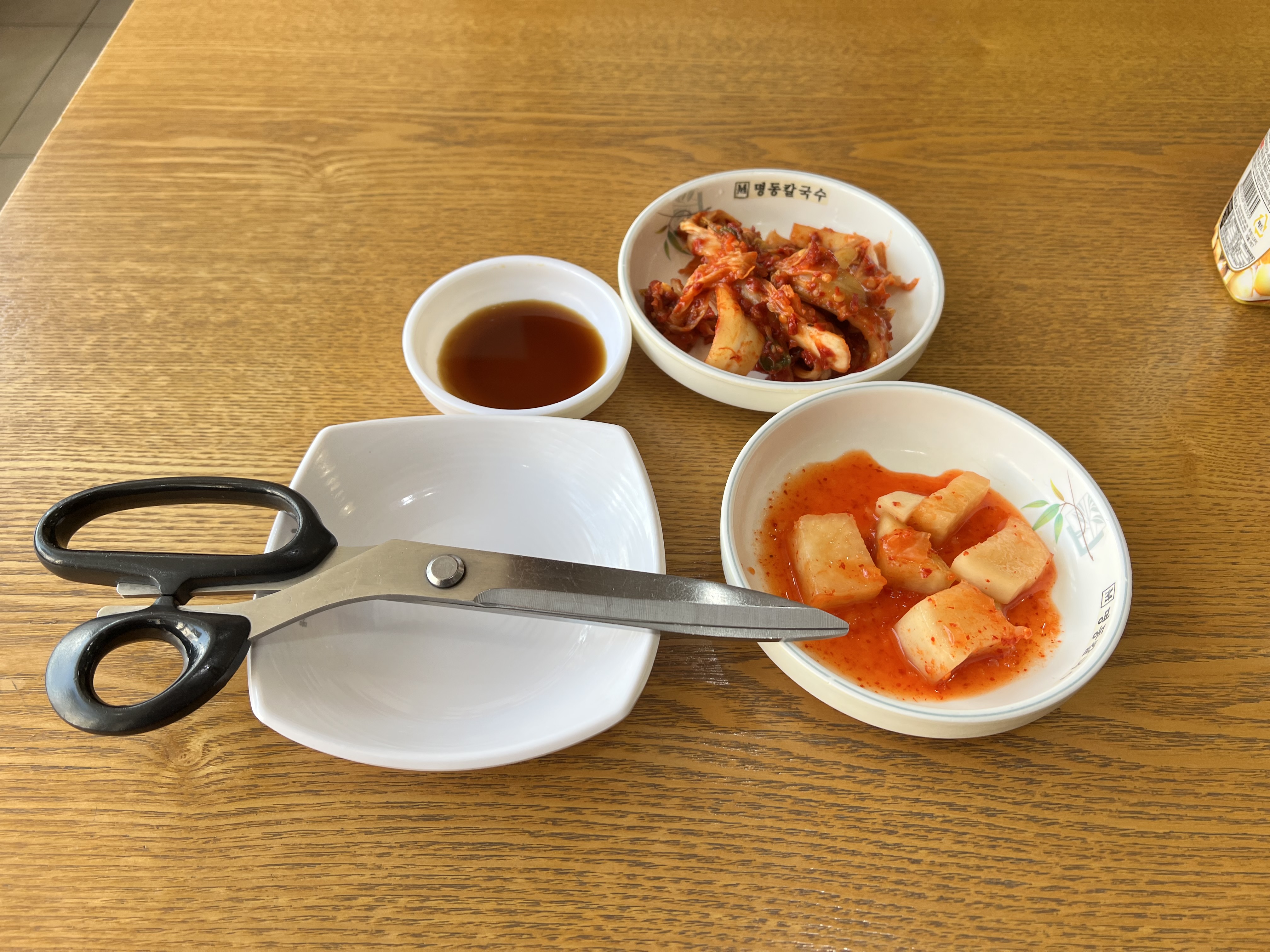 주문하자마자 앞접시 가위, 김치, 깍두기, 간장이 세팅됩니다.