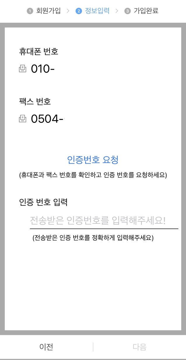 5. 휴대폰으로 인증번호를 받은 후 인증합니다.