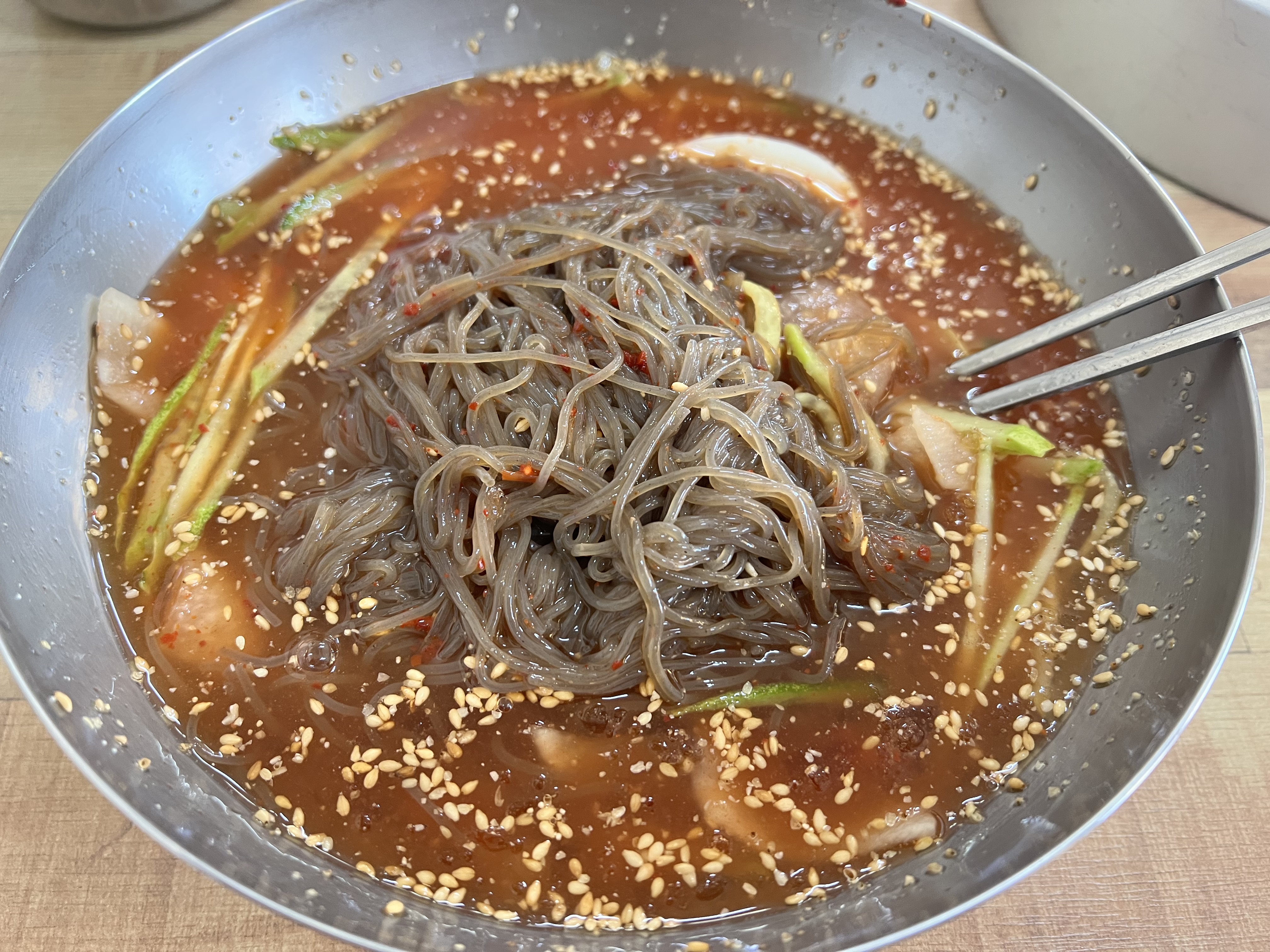 기본적으로 양념장이 올려져 있어 양념장을 풀면 굉장히 자극적인 색으로 변합니다.