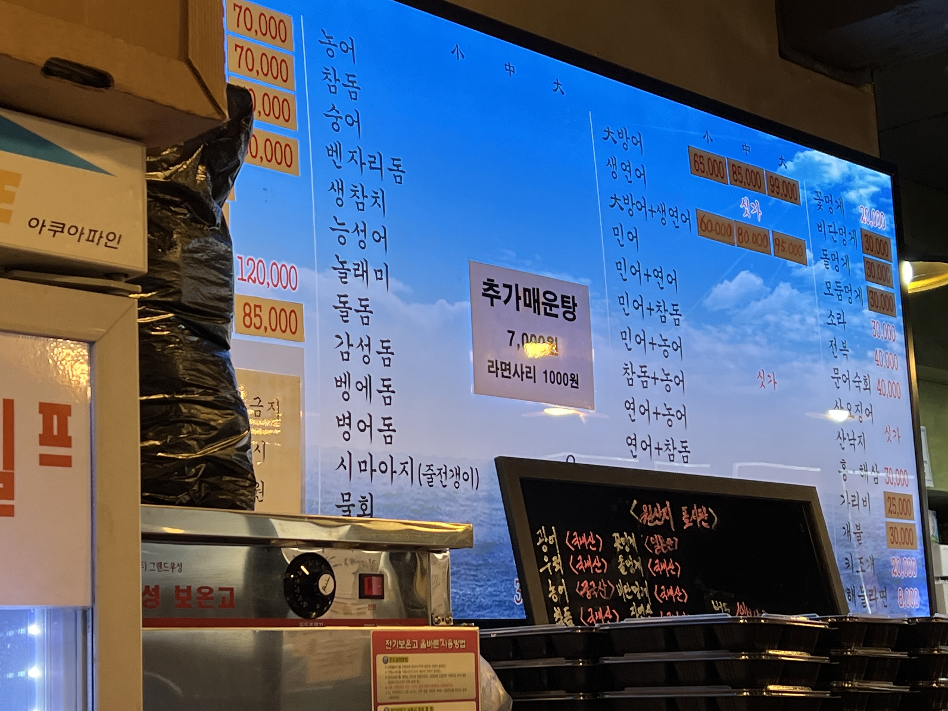 내부엔 테이블이 굉장히 많습니다. 1호점에 비해 쾌적한 환경을 제공합니다. 메뉴를 살펴보겠습니다. 메뉴가 굉장히 많지만 사람들이 먹는 것은 대방어, 대방어+생연어 일것입니다. 대방어+생연어 중자를 주문하였습니다. 대방어 가격도 계속 올라가네요. 대방어(65 / 85 / 99) 대방어+생연어(60 / 80 / 95)입니다.