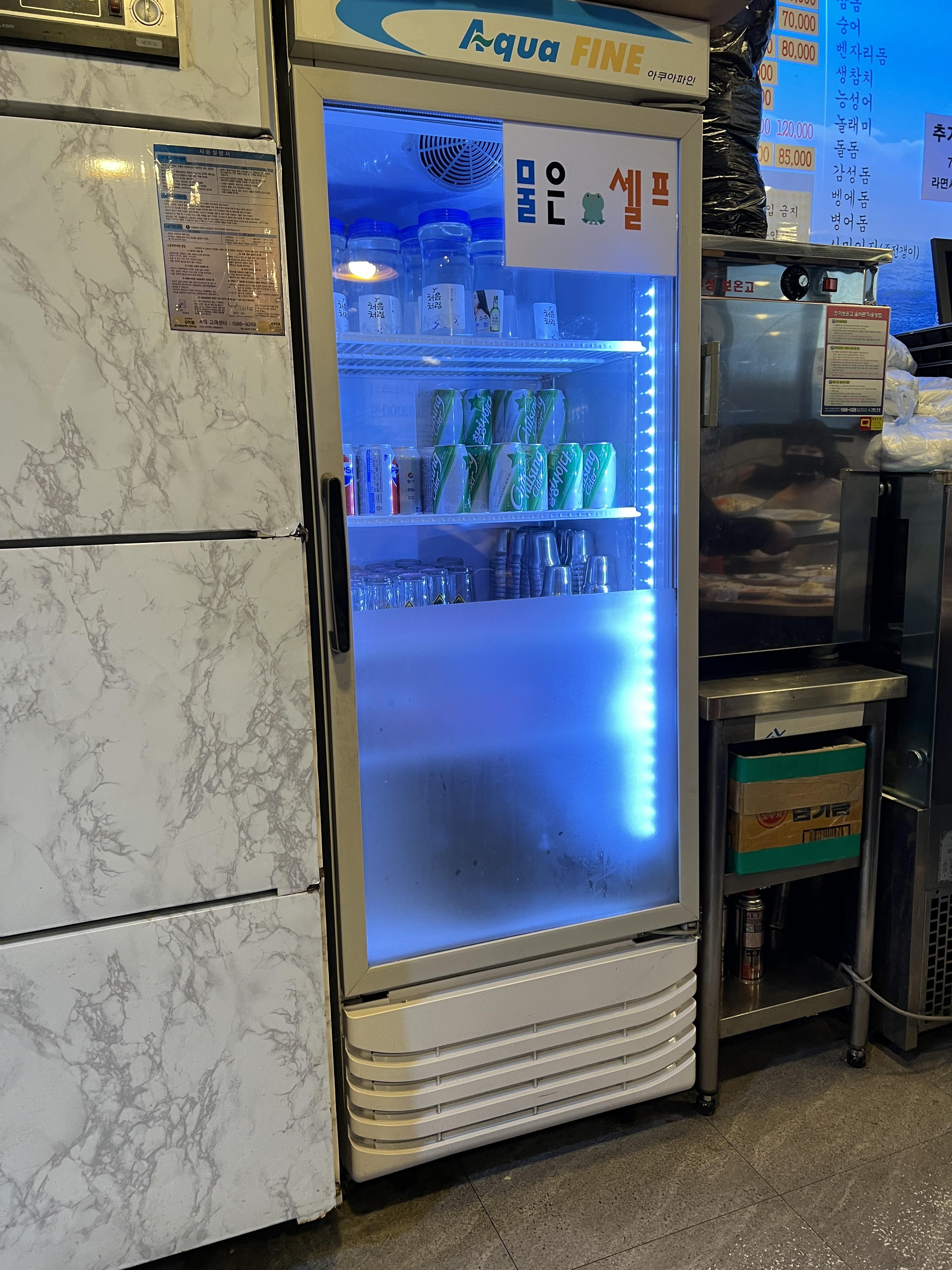 물은 셀프이며 물컵은 물이 보관되어 있는 냉동고 한켠에 있습니다. 물을 가져올 때 함께 가져오세요.