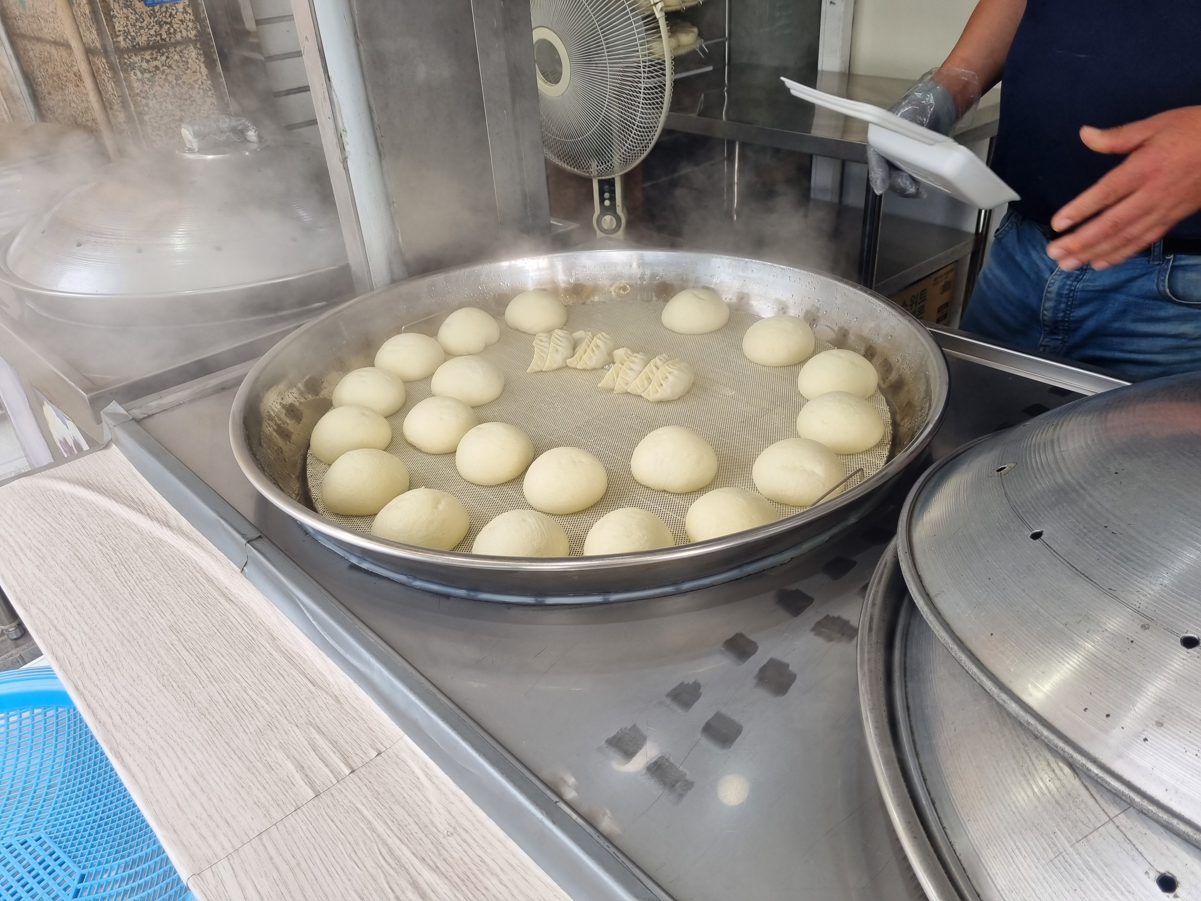 남자 사장님께서 맛있어보이는 왕만두와 통만두를 찜통에 넣어주십니다.