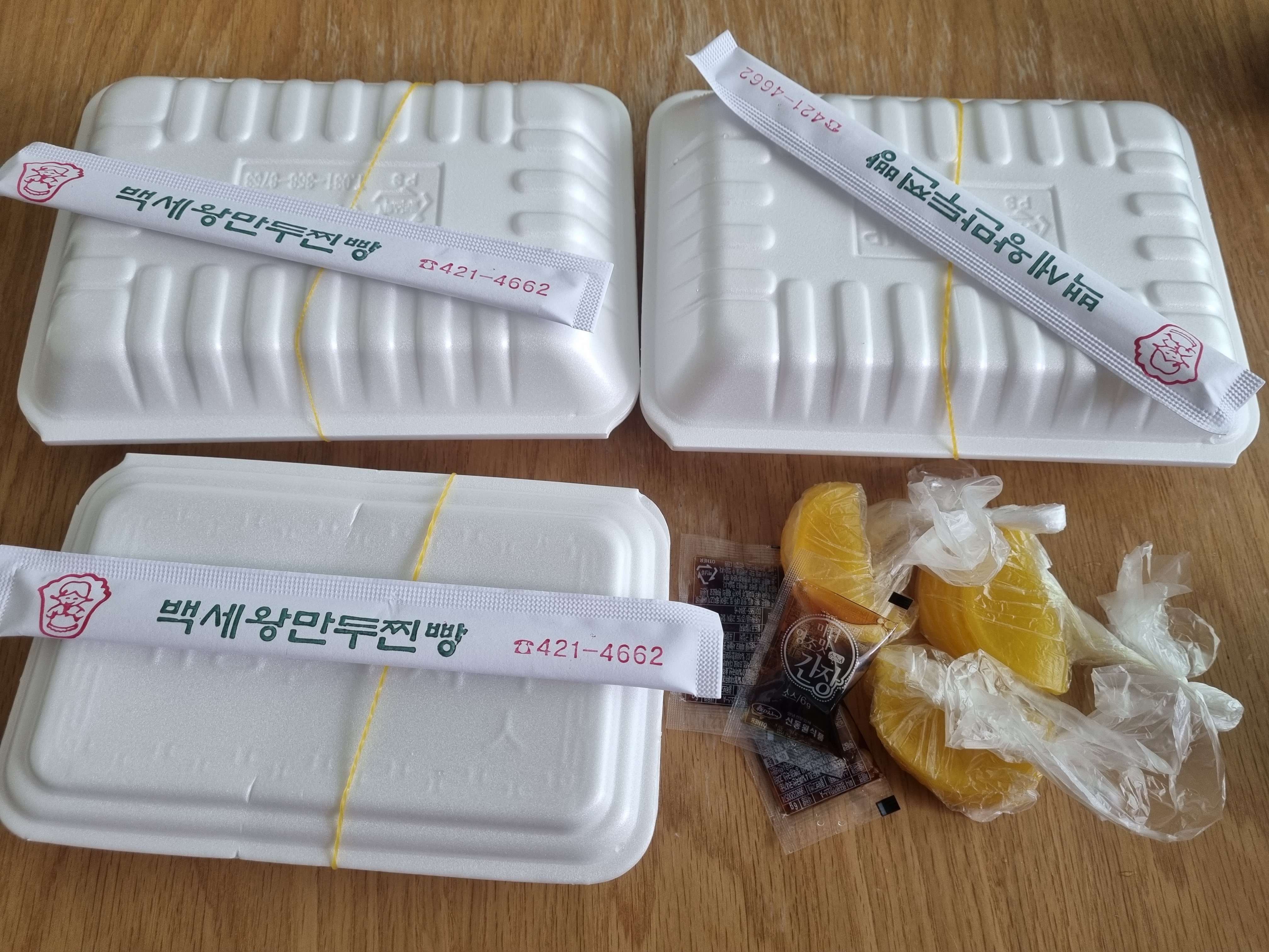 비닐봉지를열어 만두와 맛간장, 단무지, 나무젓가락을 꺼냈습니다.
