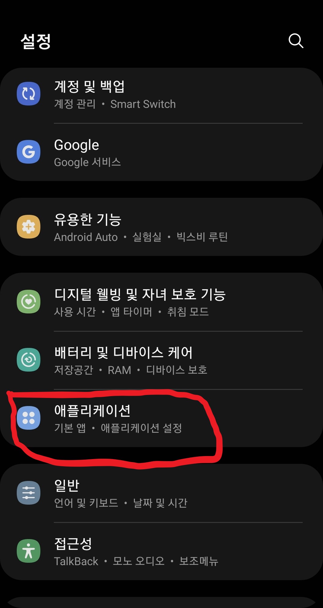 1. 안드로이드 휴대폰의 설정 -> 애플리케이션으로 들어갑니다.