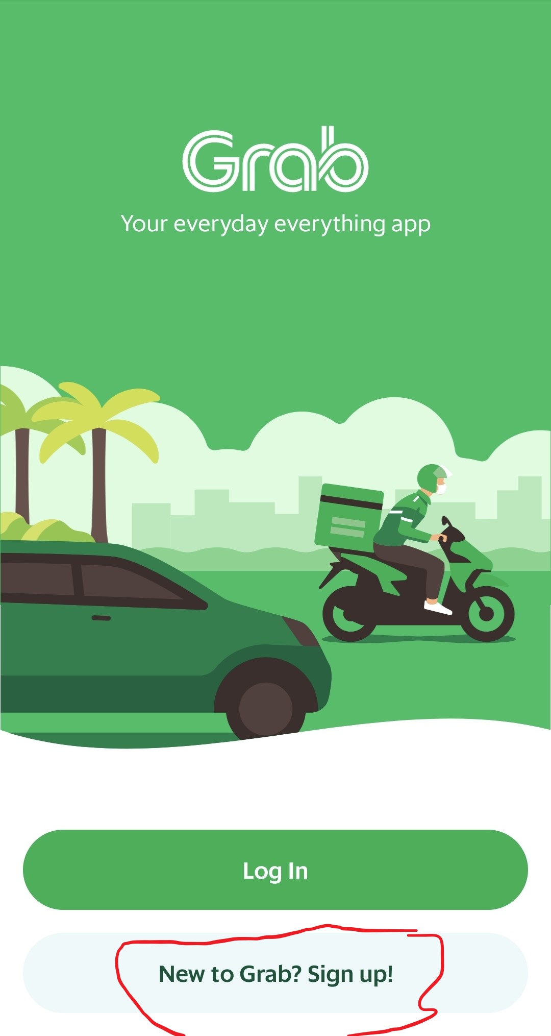 무슨 어플이라도 일단 회원가입을 해야겠죠? 어플을 실행하면 아래 사진의 화면이 나오는데 하단의 NEW TO GRAB? SIGN UP!!을 터치해 줍니다.