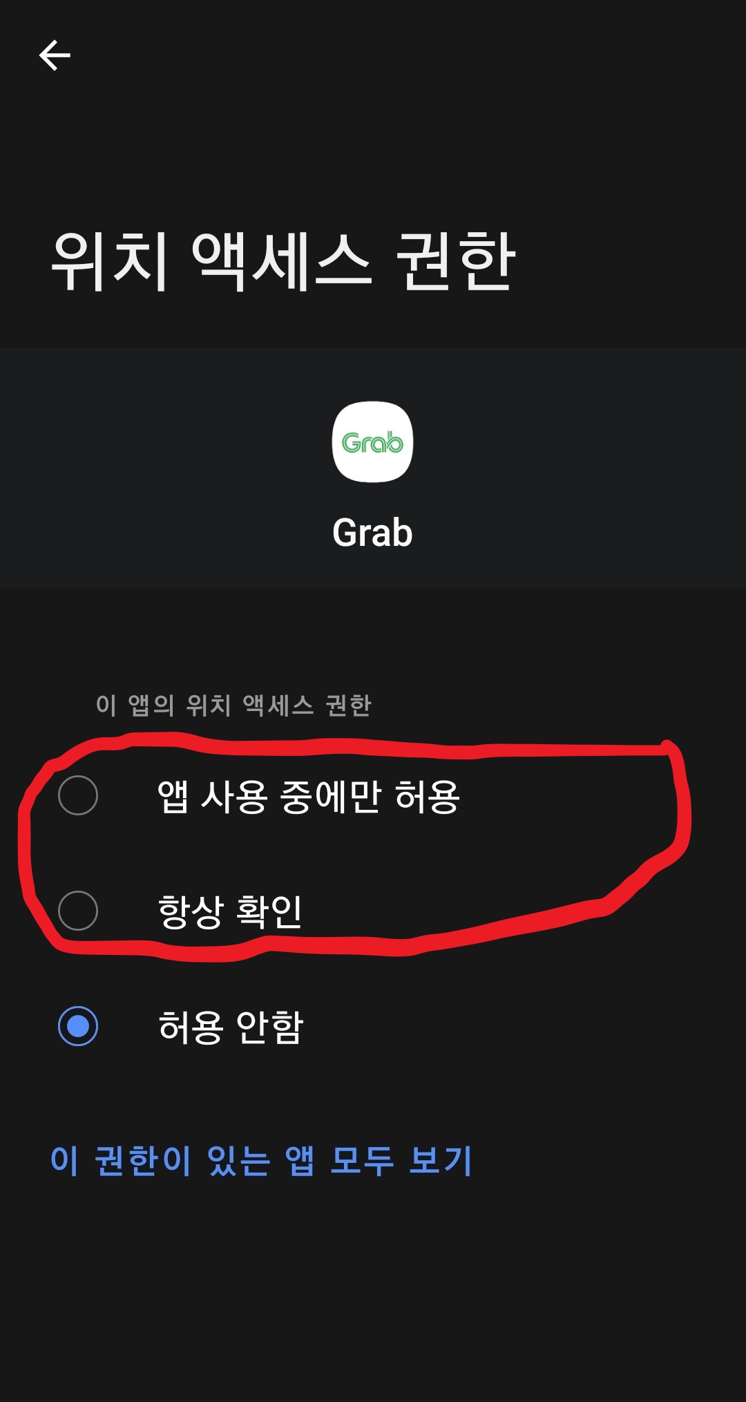 5. 위치 권한을 앱 사용 중에만 허용 또는 항상 확인으로 설정하여 그랩(GRAB) 어플이 위치 정보를 이용할 수 있게 권한을 줍니다.