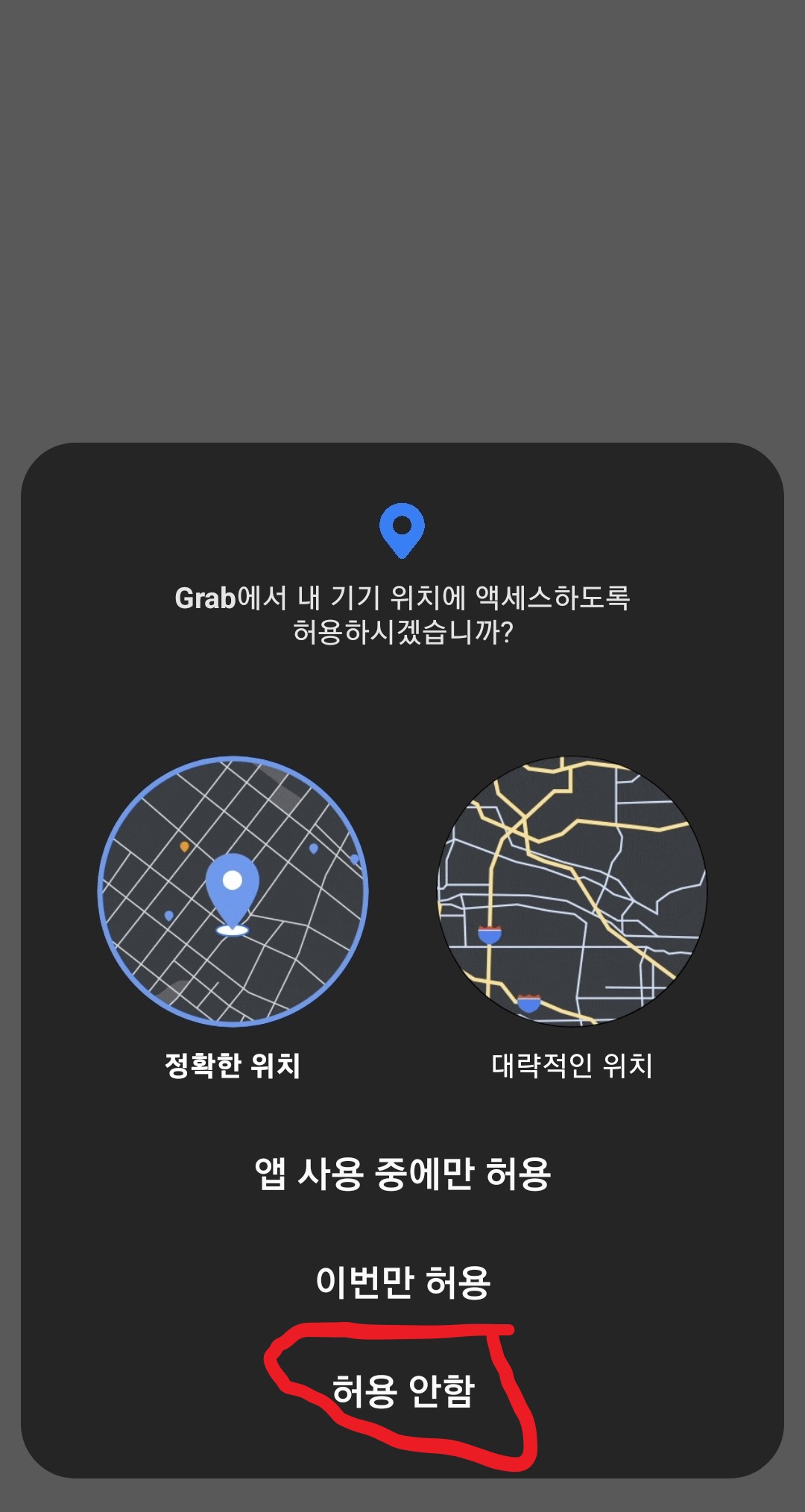 회원가입은 끝났고 이제부터가 중요합니다. 위치 권한을 요청하는 화면이 나오면 허용하지 않음을 반드시 눌러줘야합니다.