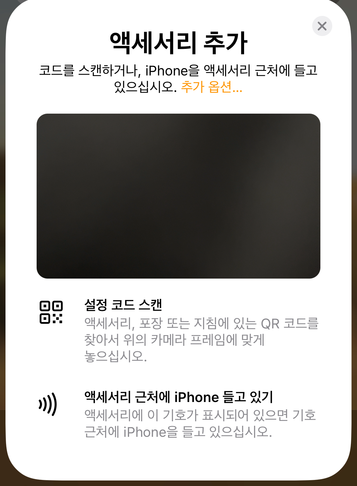 여기까지는 별 어려운 없이 진행했으나 고난이 찾아옵니다. 애플 "홈" 어플에 스피커가 등록이 되지 않는 것입니다. 애플 홈에 등록을 해야 "에어플레이"를 이용할 수 있는데... 애플 홈에서 제품을 등록하려 해도 제품을 인식하지를 못하였습니다. 기기 추가를 누르면 아래와 같은 사진이 뜨는데 QR 코드로 등록하는 것인가 해서 전원에 있는 QR코드도 찍어보고 했지만 등록이 되지 않았습니다.