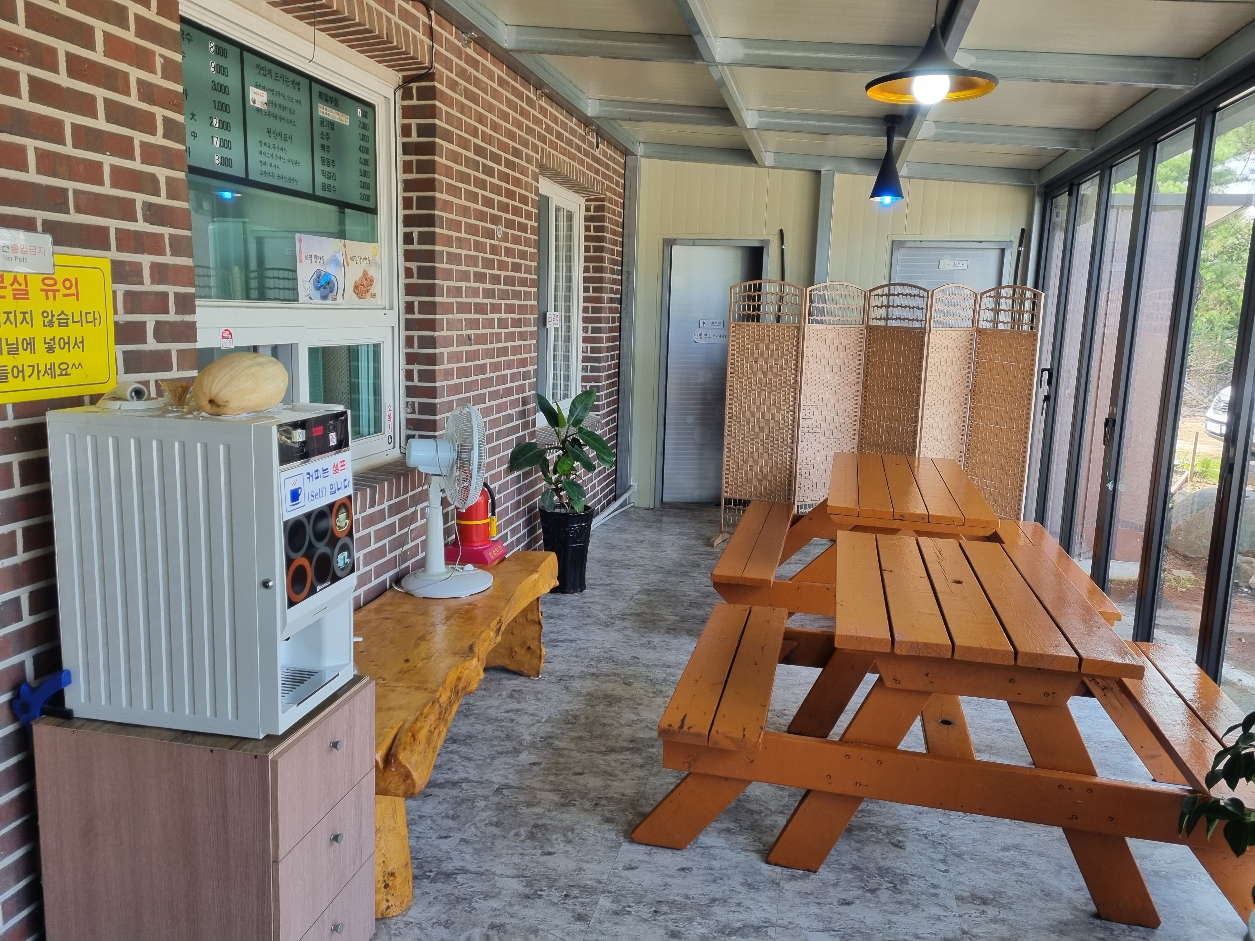 입구로 들어가면 야외는 아니지만 신발을 벗지 않고 먹을 수 있는 테이블과 화장실이 보입니다.