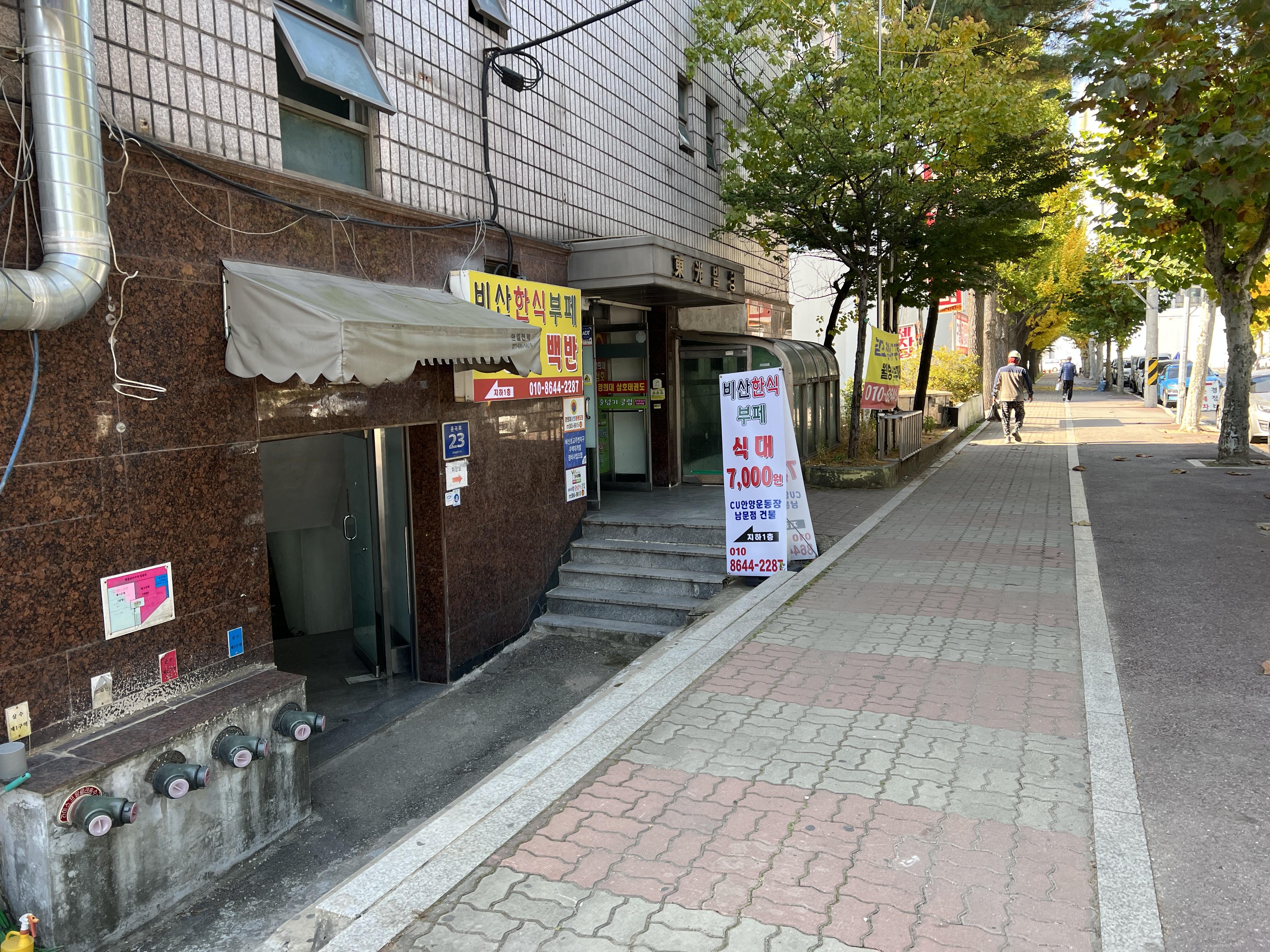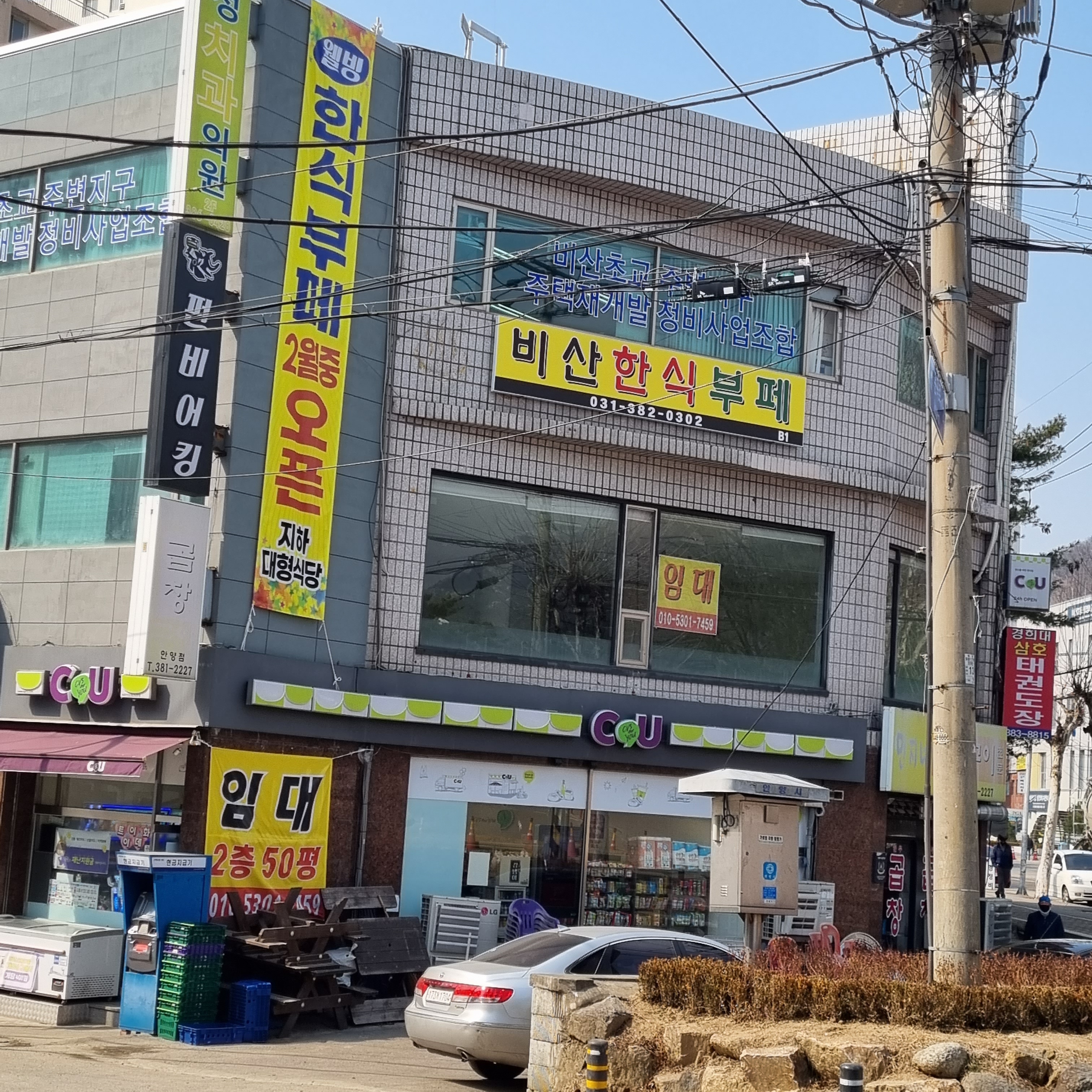 위 사진에 보이는 CU를 정면으로 바라보고 건물의 오른쪽으로 가면 비산한식뷔페 7,000원이라고 적힌 입간판이 보입니다. 화살표를 따라서 지하로 내려가면 됩니다.