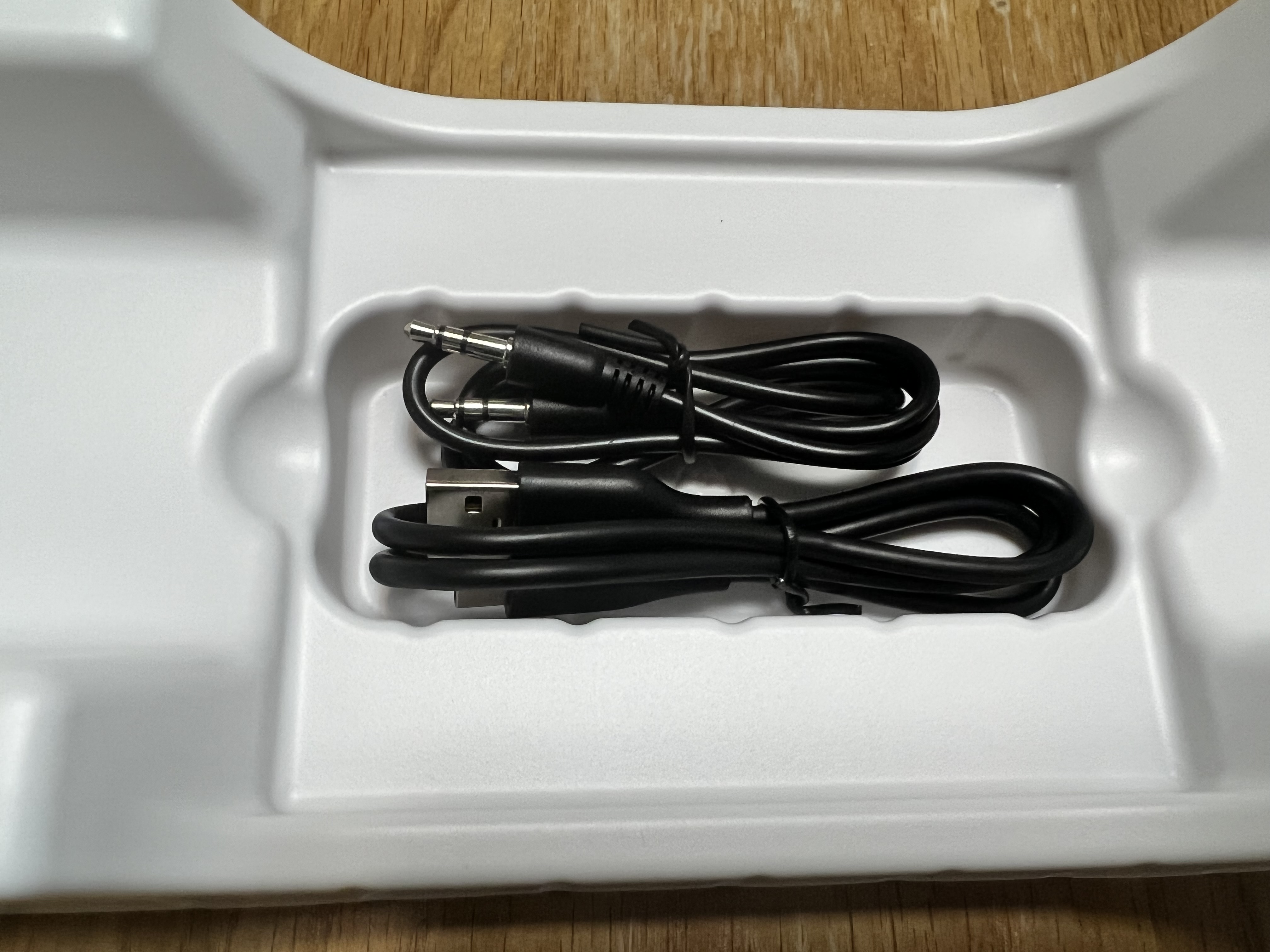 AUX선, USB-C 타입 충전 케이블이 보입니다.