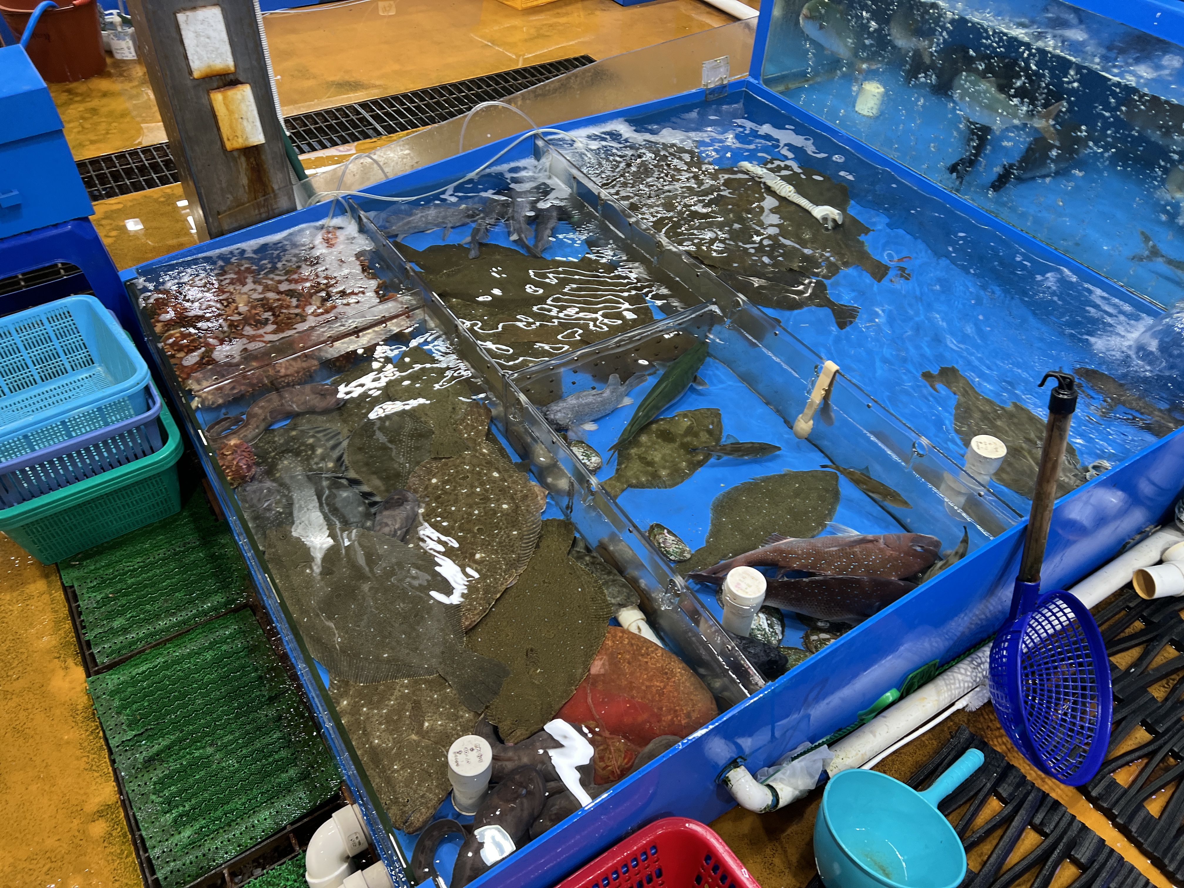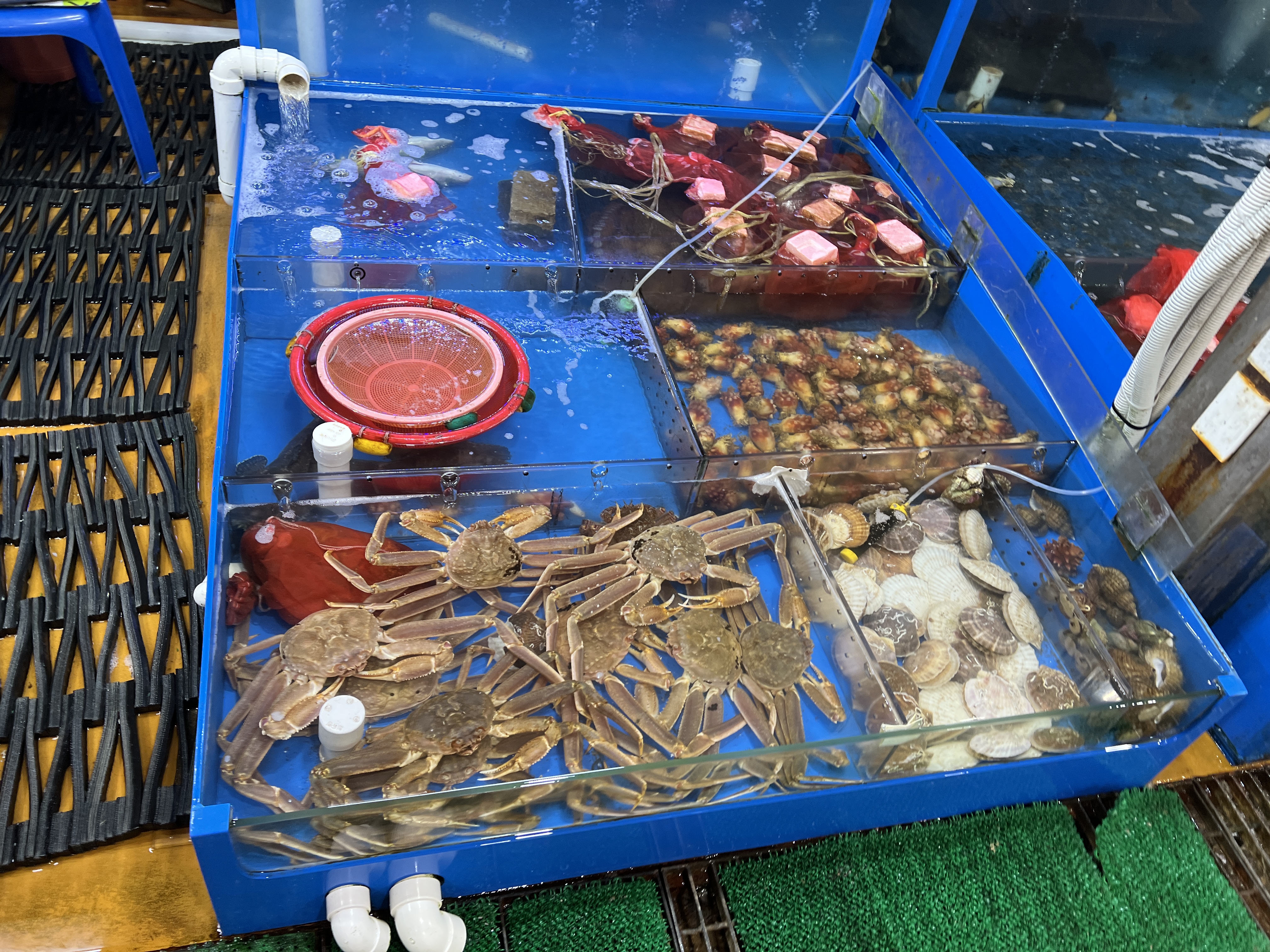 매대가 크지는 않지만 다양한 생선과 해산물이 보입니다.