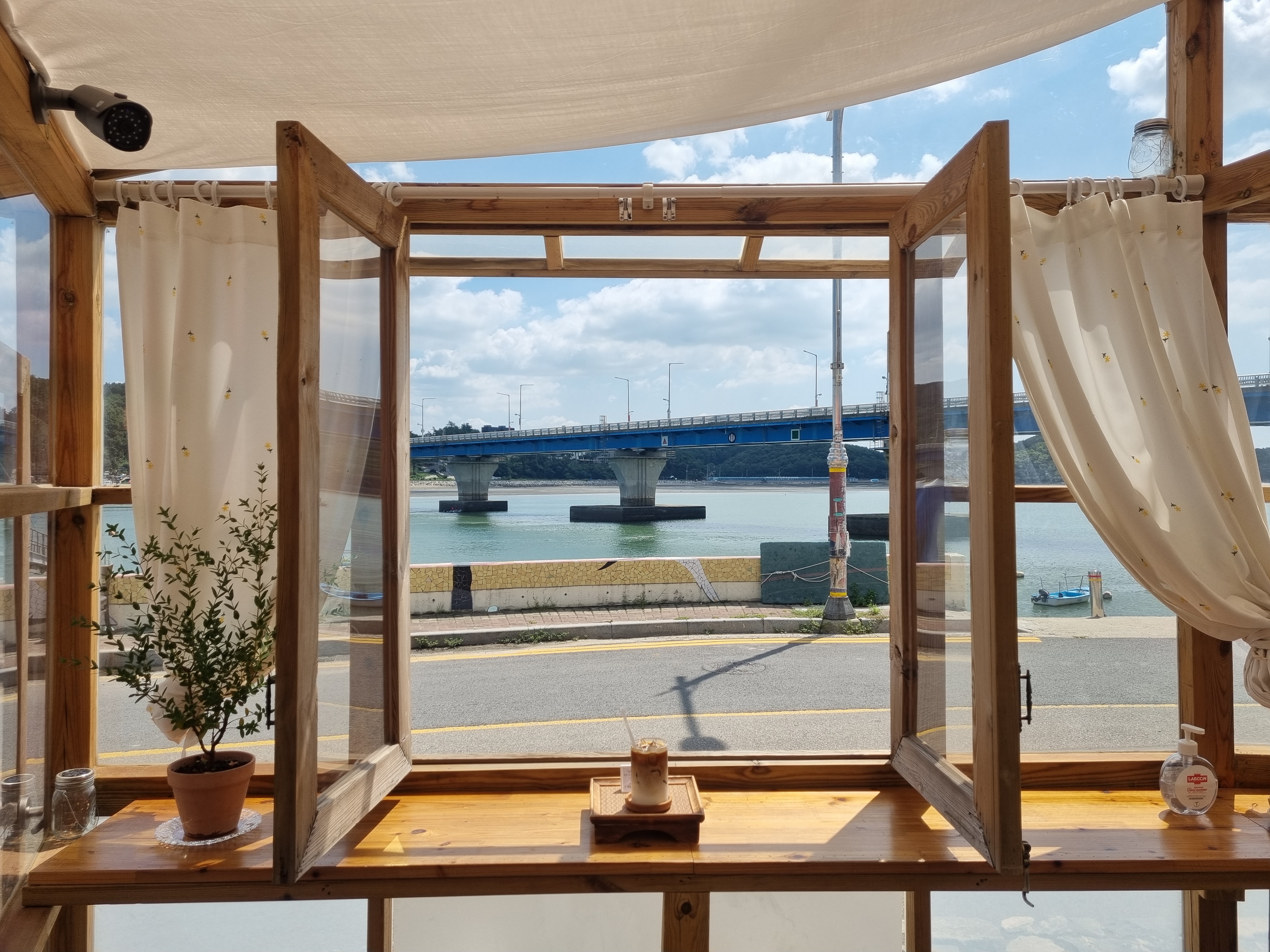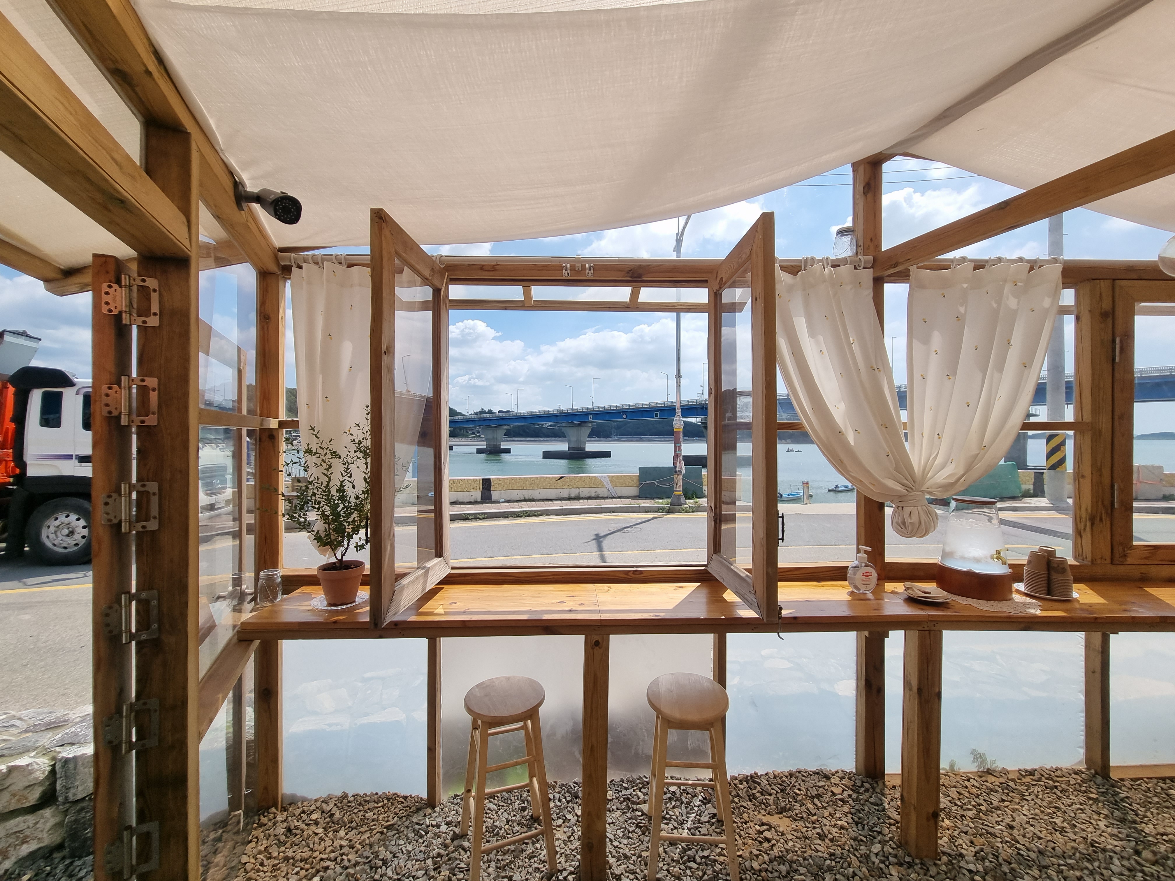 대부도 / 선재도 예쁜 카페 선재리 커피집에는 목조로 된 창문을 통해 선재대교와 바다를 감상할 수 있게 자리가 마련되어 있습니다.
