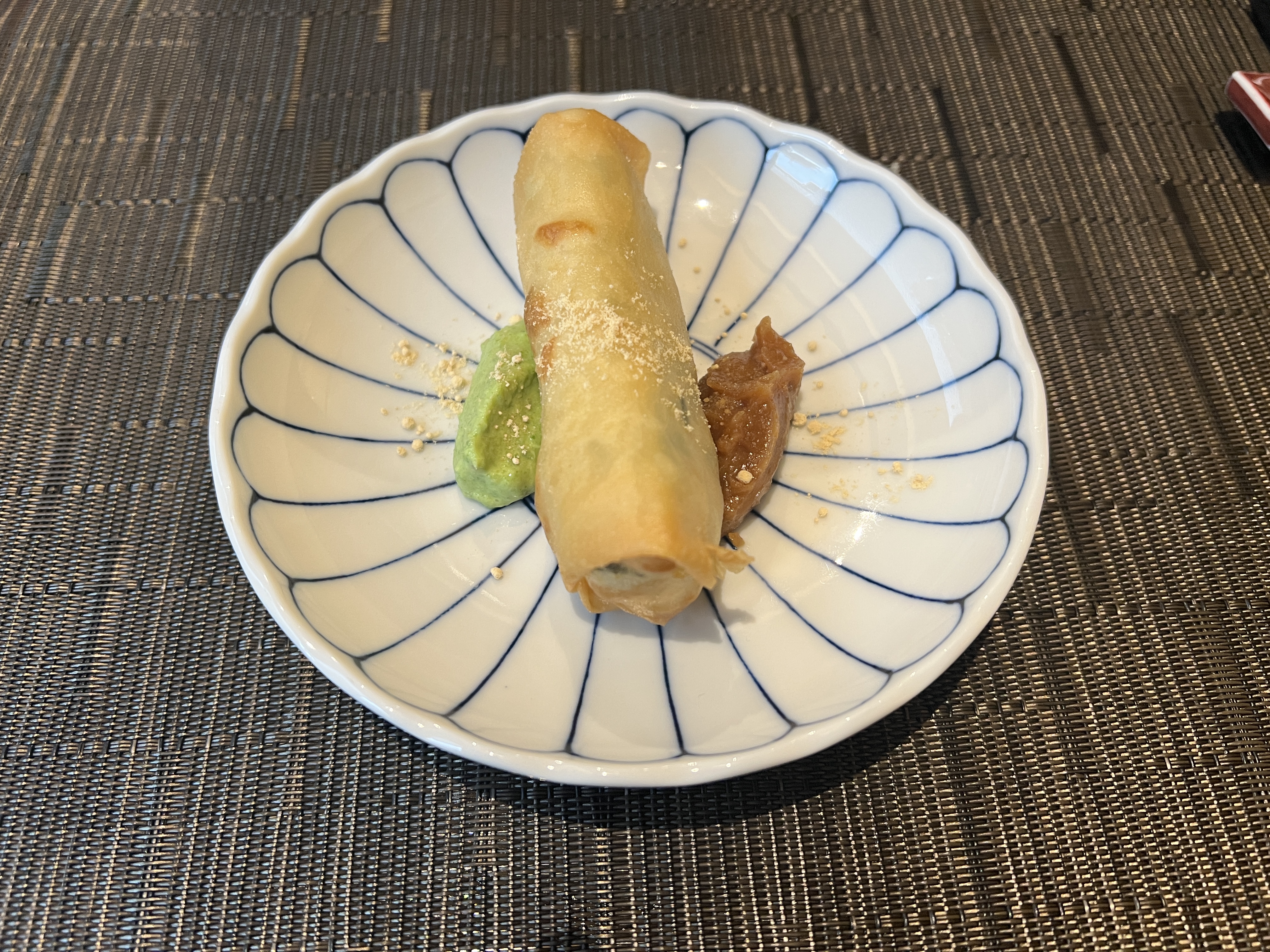 춘권 안에는 상어고기와 영양부추로 속을 만들어 채워져 있습니다. 소스는 그린빈 소스와 땅콩소스를 상큼하게 만들어 기호에 맞게 찍어먹으면 되었습니다. 상어고기는 동해를 대표하는 생선이었는데 시장원리에 따라 어선이 줄어들어 동해 상어고기가 아닌 원양어선에서 잡은 거지만 참치를 취급하다 보니 대형 생선을 메뉴에 넣어봤다고 하십니다.