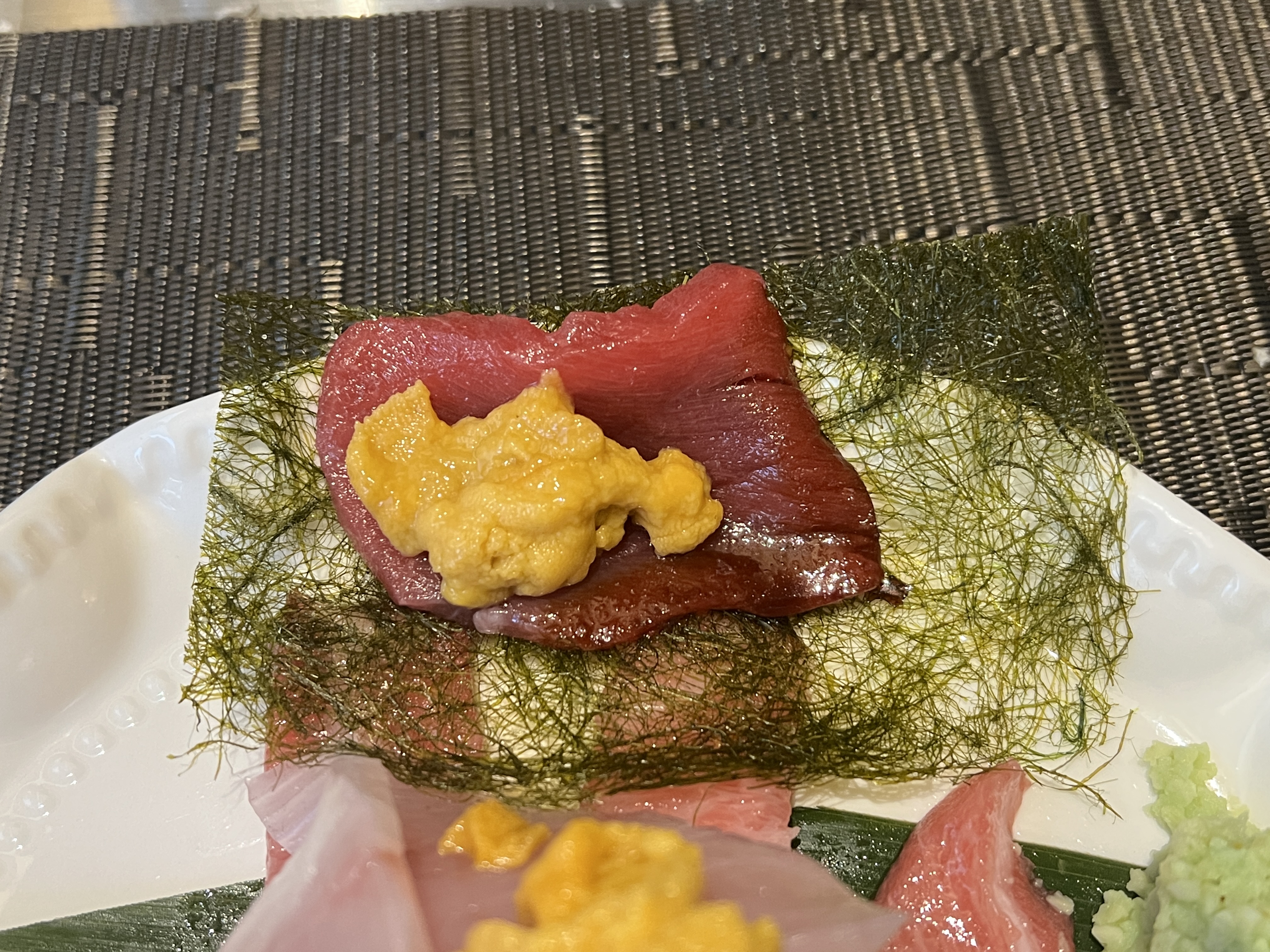 코보레스시는 일본에서 행운이 넘쳐흐르라는 의미로 제공된다고 합니다. 보통 회로 많이 하는데 밑에 초밥 밥을 깔고 그 위에 네기도로라 불리는 참치 속살과 파를 다진 걸 양념하고 그 위에 참치는 참다랑어 중에 최고인 1번 도로만 사용한다고 합니다. 맨 위에 있는 뱃살 부분으로 가장 좋은 것이라고 합니다. 그 위에는 자연산 부시리로 속초 앞바다 자연산이라고 합니다. 회 위에 우니를 폭탄으로 정말 흘러넘치게 담아주십니다. 좋은 재료를 아낌없이 담아주며 재밌게 설명도 해주셔서 좋았습니다. 맛이야 환상이었습니다. 저 재료들이면 맛을 평가하는 것 자체가 무의미하다고 생각합니다. 좋은 재료들을 감태에 싸서 먹으면 궁합이 정말 잘 맞았습니다.