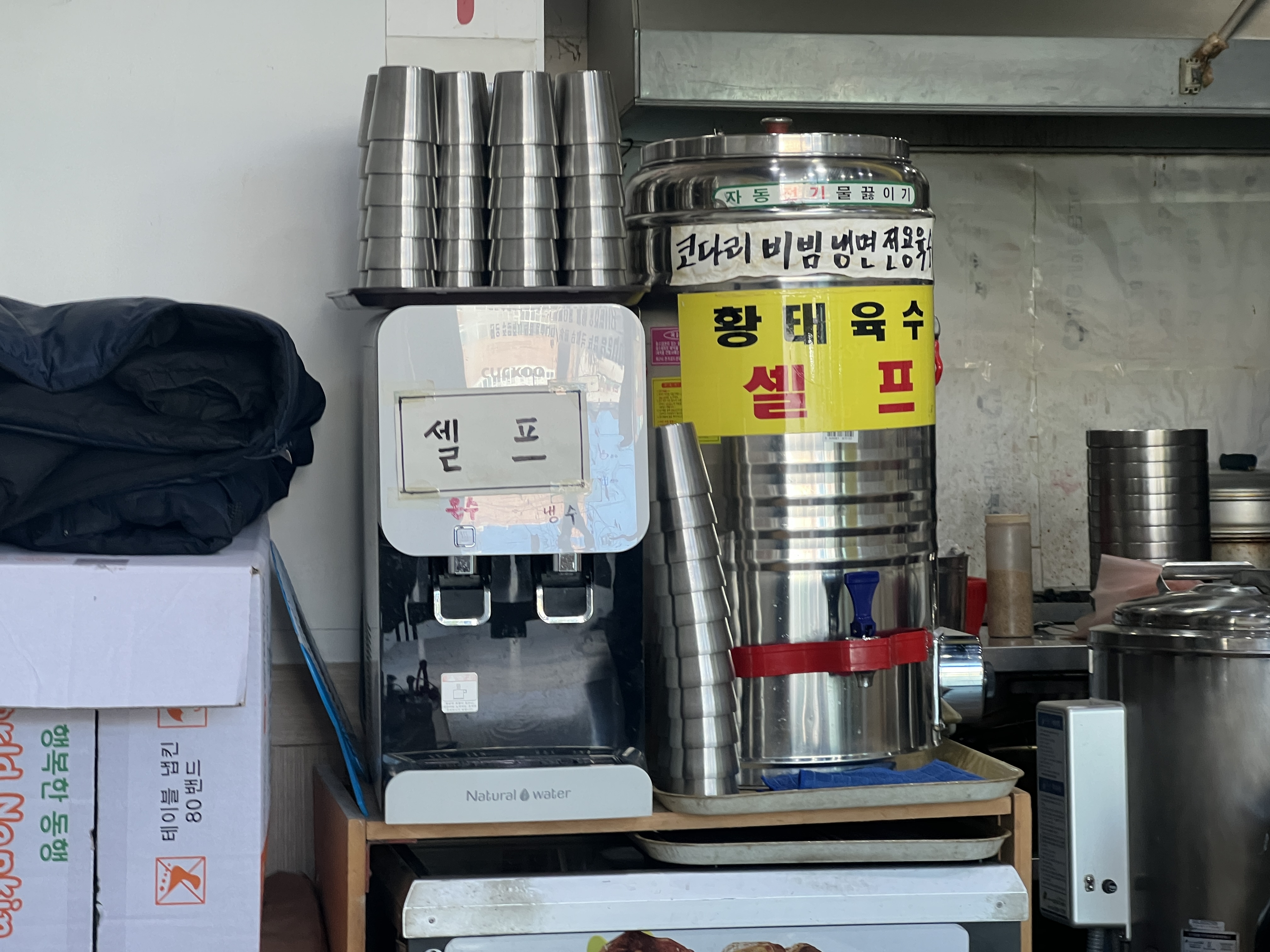 냉면집에 온육수가 있는 것은 많이 봐왔는데 특이하게 "황태육수"가 있습니다. 물과 육수는 셀프이기 때문에 직접 챙겨 옵니다.