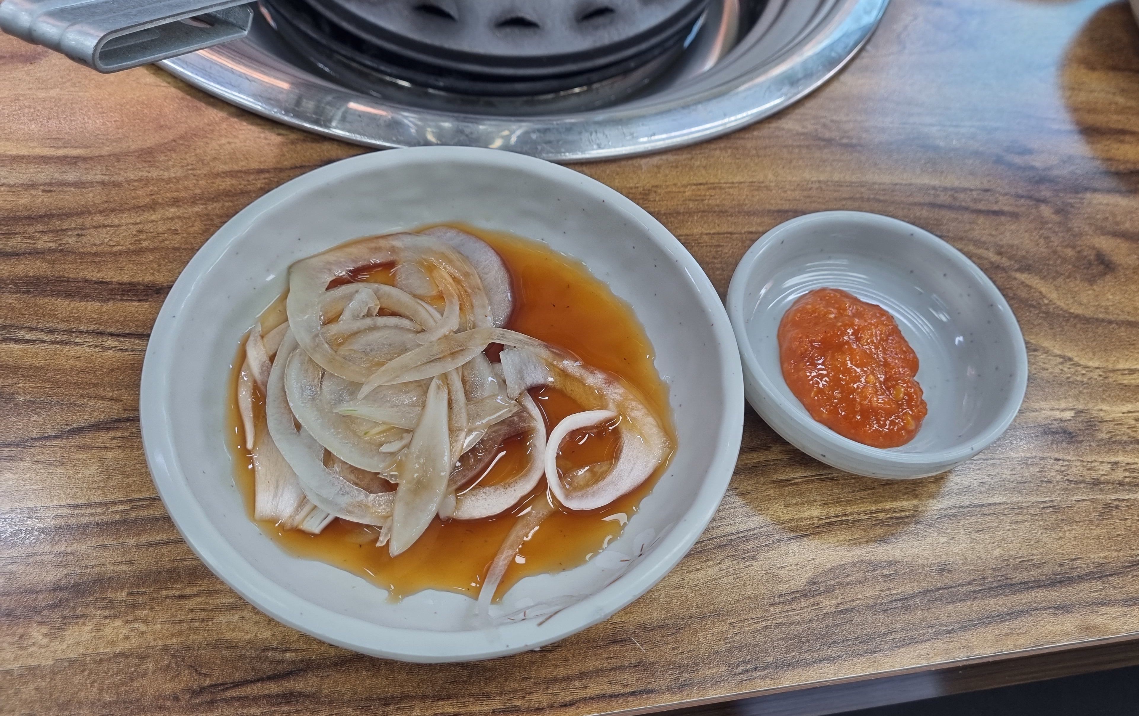 돼지갈비에 빠질 수 없는 양파간장절임소스 및 쌈장도 제공됩니다.