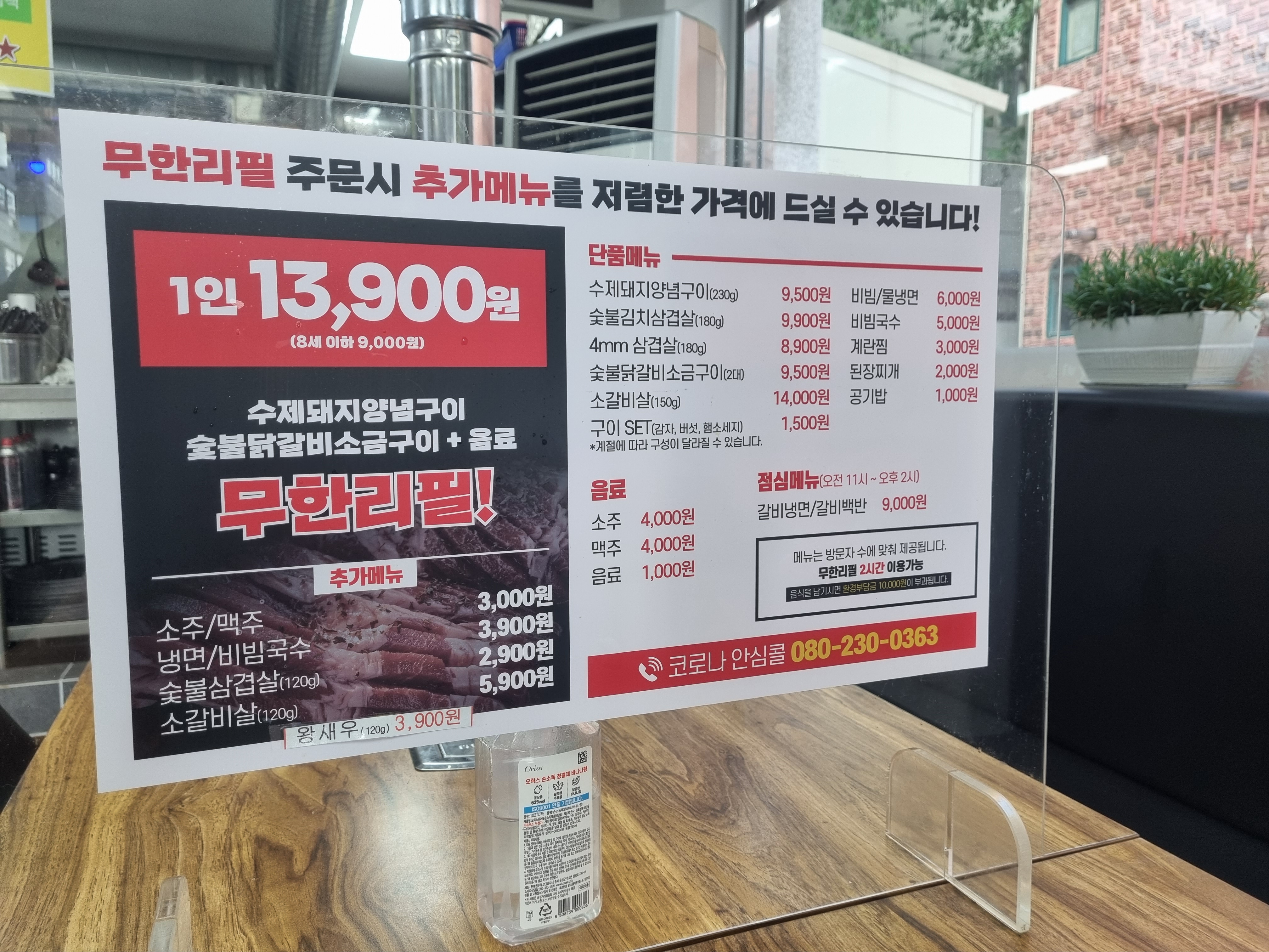 우선 1인 13,900원에 수제돼지양념구이+숯불닭갈비소금구이+음료를 무한리필로 먹을 수 있는