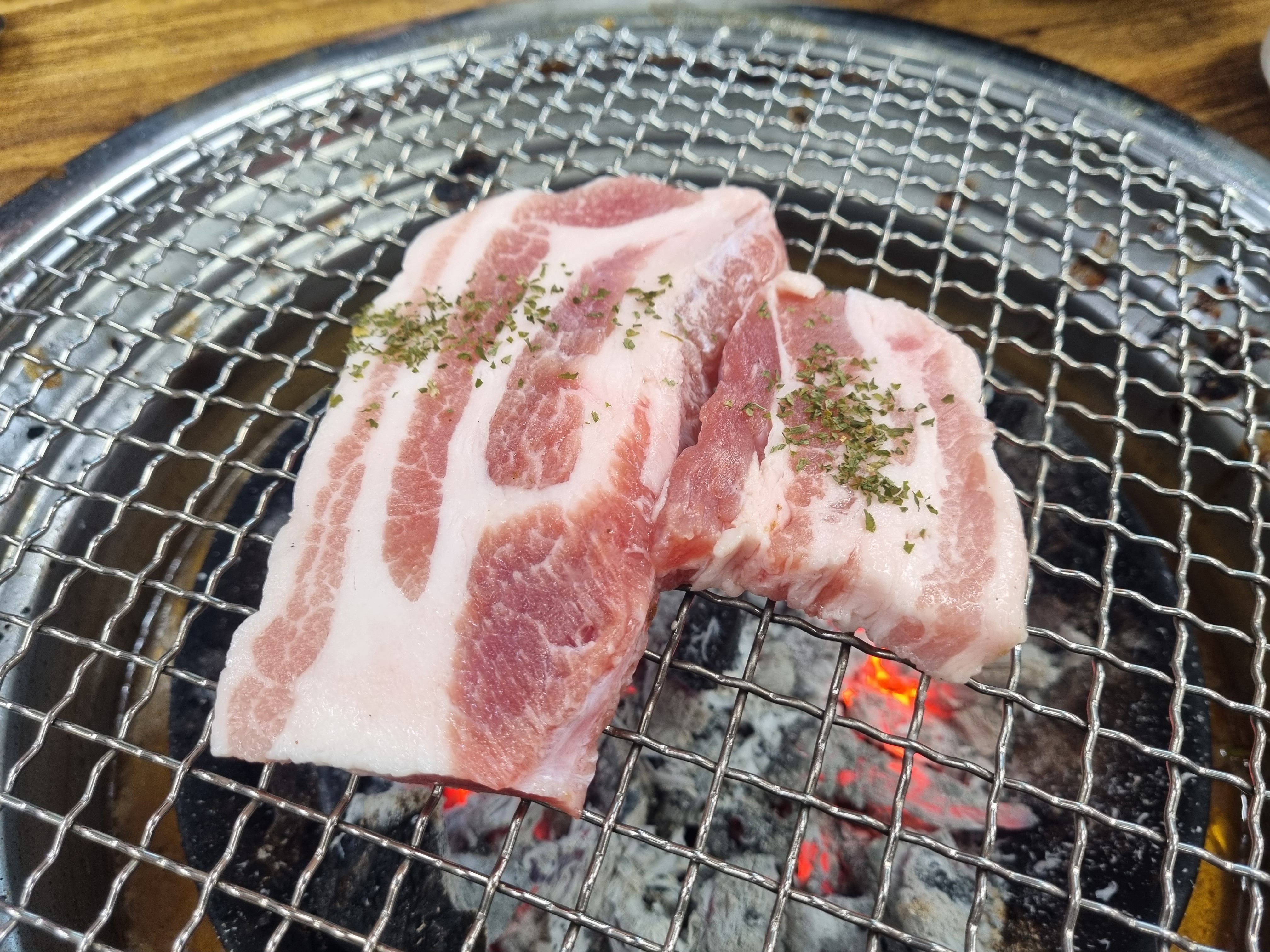 불향을 가득 머금길 바라면서 숯불위에 예쁘게 올려주었습니다.