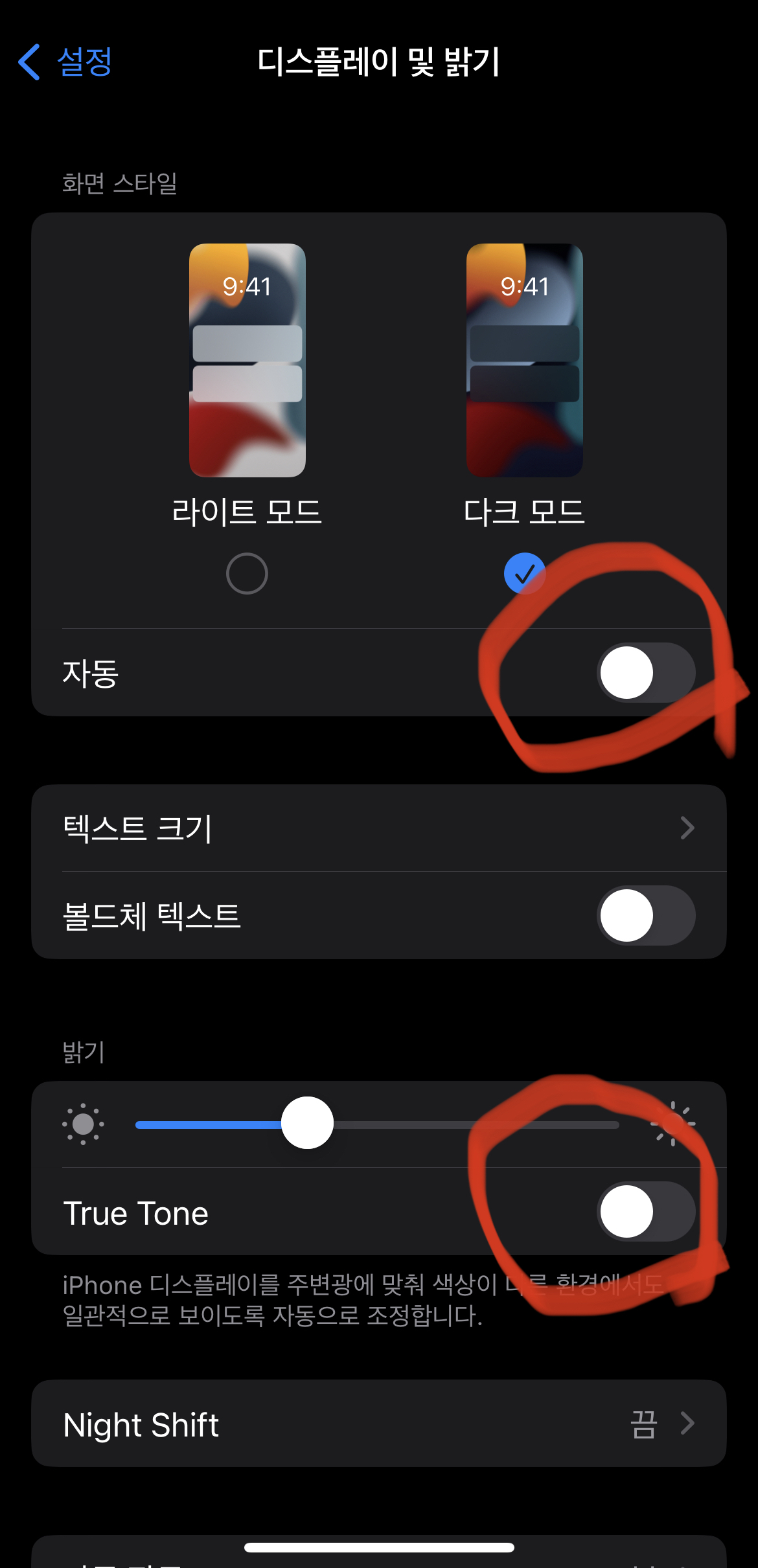 2. 화면 스타일에 자동 항목과 밝기에 True Tone 항목을 모두 꺼줍니다.