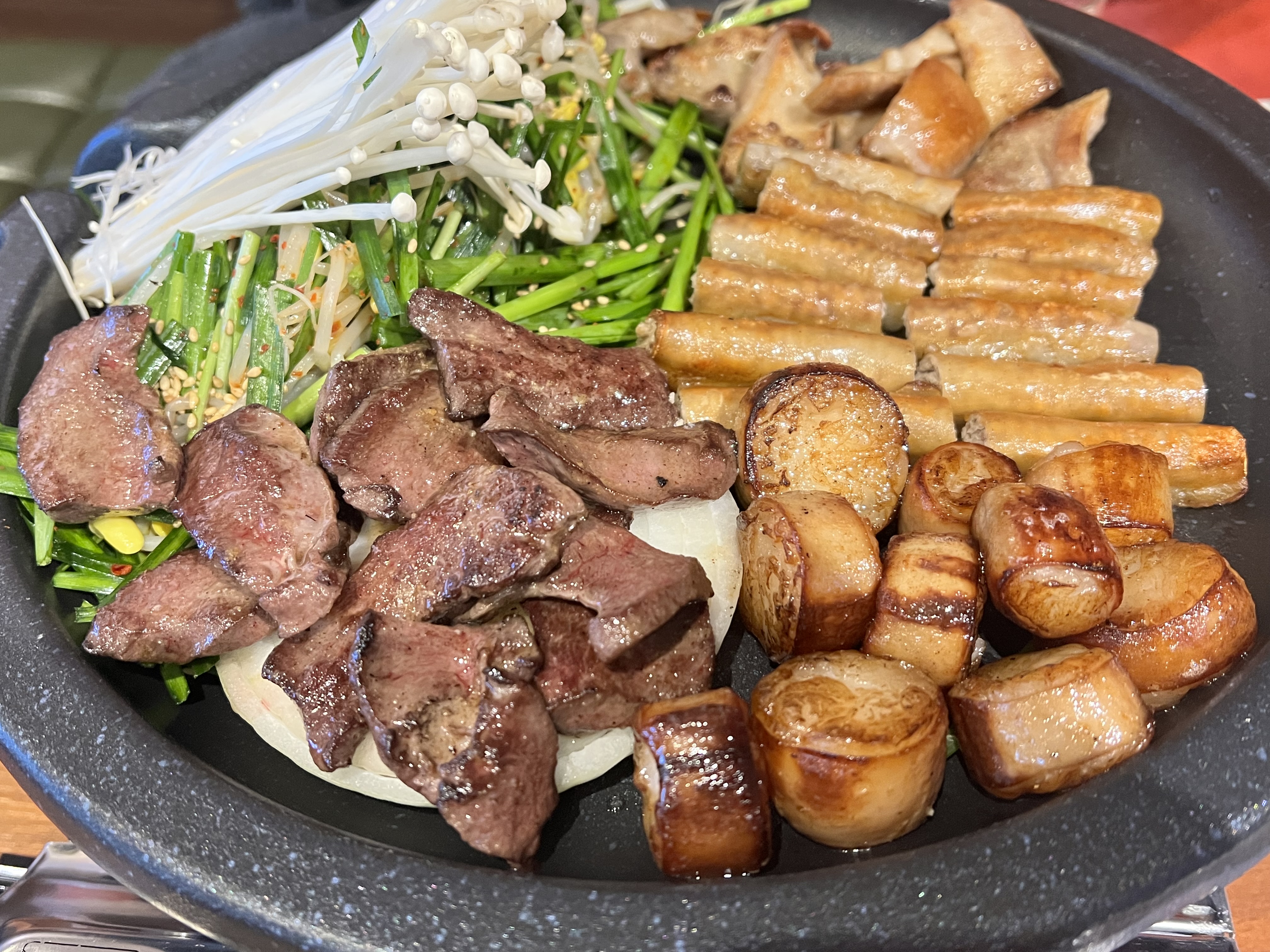 각 구역별로 곱창, 대창, 막창, 염통, 채소무침, 버섯이 놓여 있습니다.